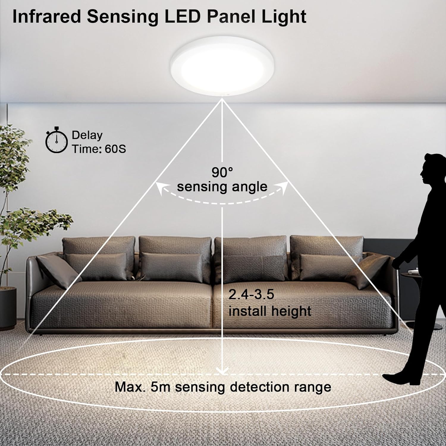 Sensing Angle: 90 degree Sensor Range: 3M~5M(9.8-16.4ft) Sensing Duration: 30-60s Installation Height:Max. 3.5Meter