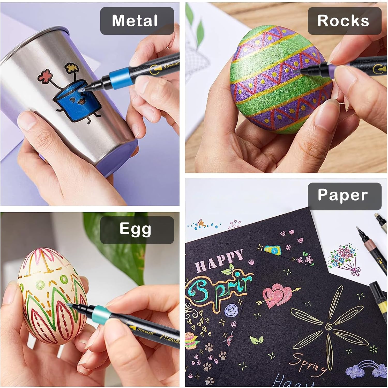 14 Vibrant Metallic Colors: Hmeuest metallic pens with shimmering ink, finely ground particles, for creat beautiful art crafts. Notice: Designed to black surface, the white applies transparent but turns opaque when dries.