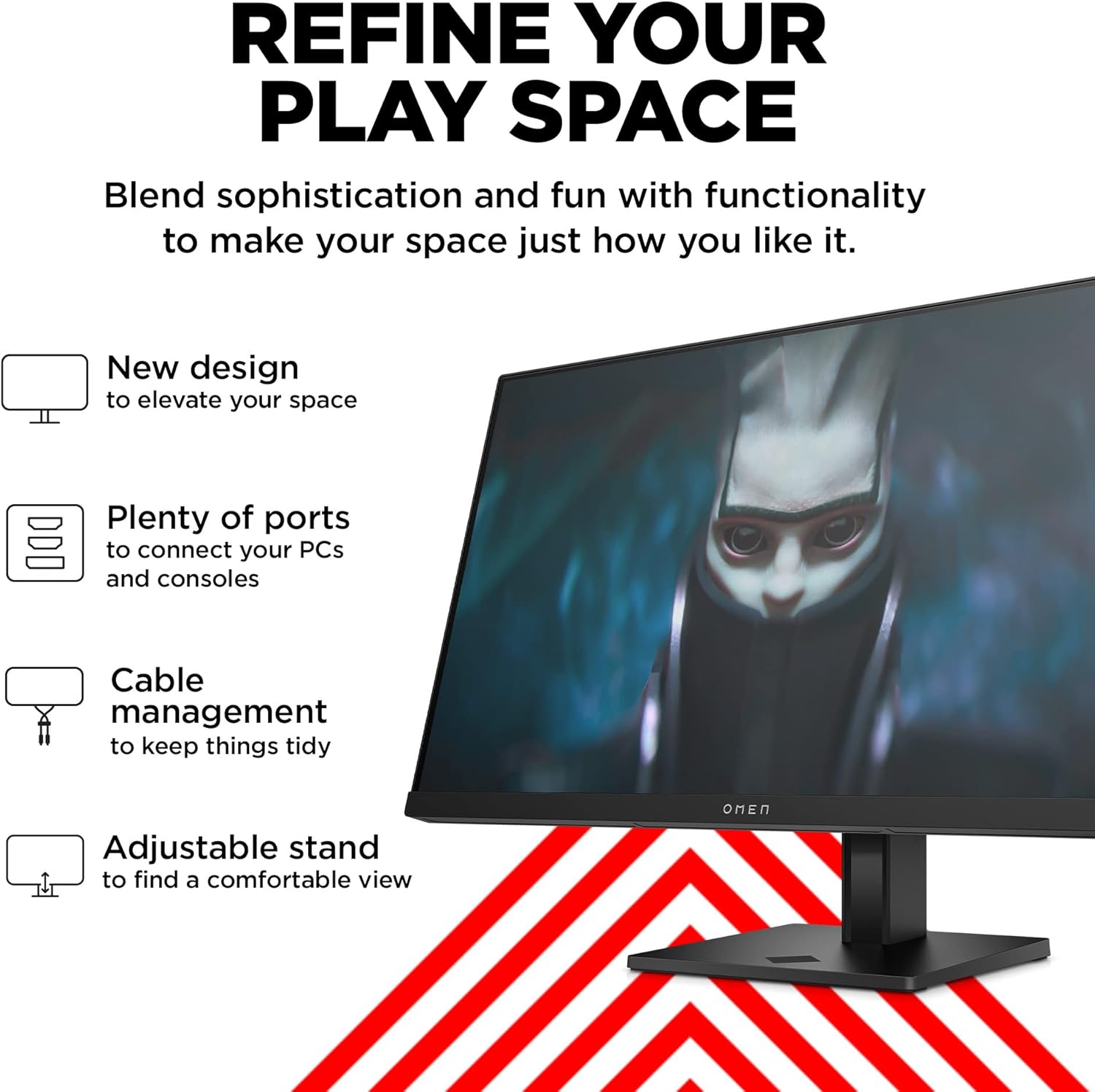 Made to impress in and out of game, the new OMEN look blends sophistication and fun to elevate what a gaming setup can look like. It’s equipped with ports perfect for connecting your gaming PC, console, and even awork PC. Thanks to the easy cable management and the adjustable stand, your desk will be just how you like it.