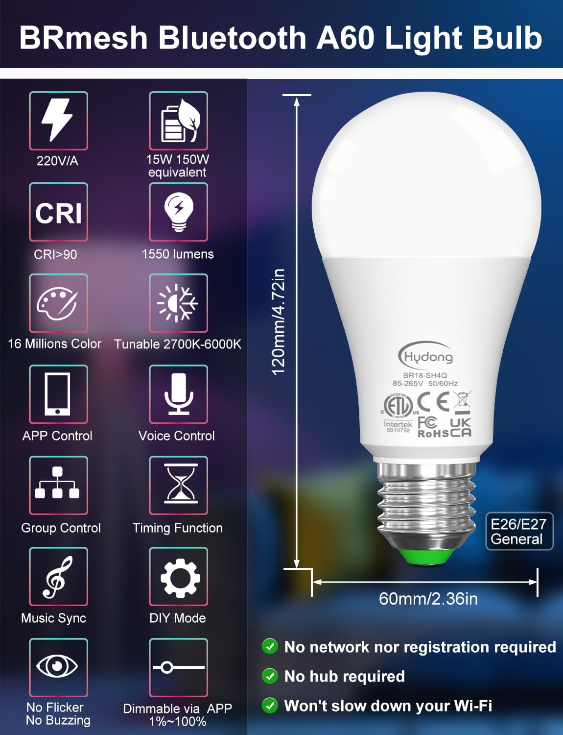 【Works with Alexa and BRmesh APP】This is a Bluetooth connected Smart Light Bulbs that supports both Alexa speakers and APP control, easy to operate, No registration, No need WIFI, No hub required. Make it possible to control your bulbs with simple voice commands; BRmesh APP provides many features that are popular with consumers but are not avaliable on Alexa, such as music sync, scenes, etc. (Note: Works Exclusively with Alexa do not compatible with Google Assistant and Apple HomeKit)