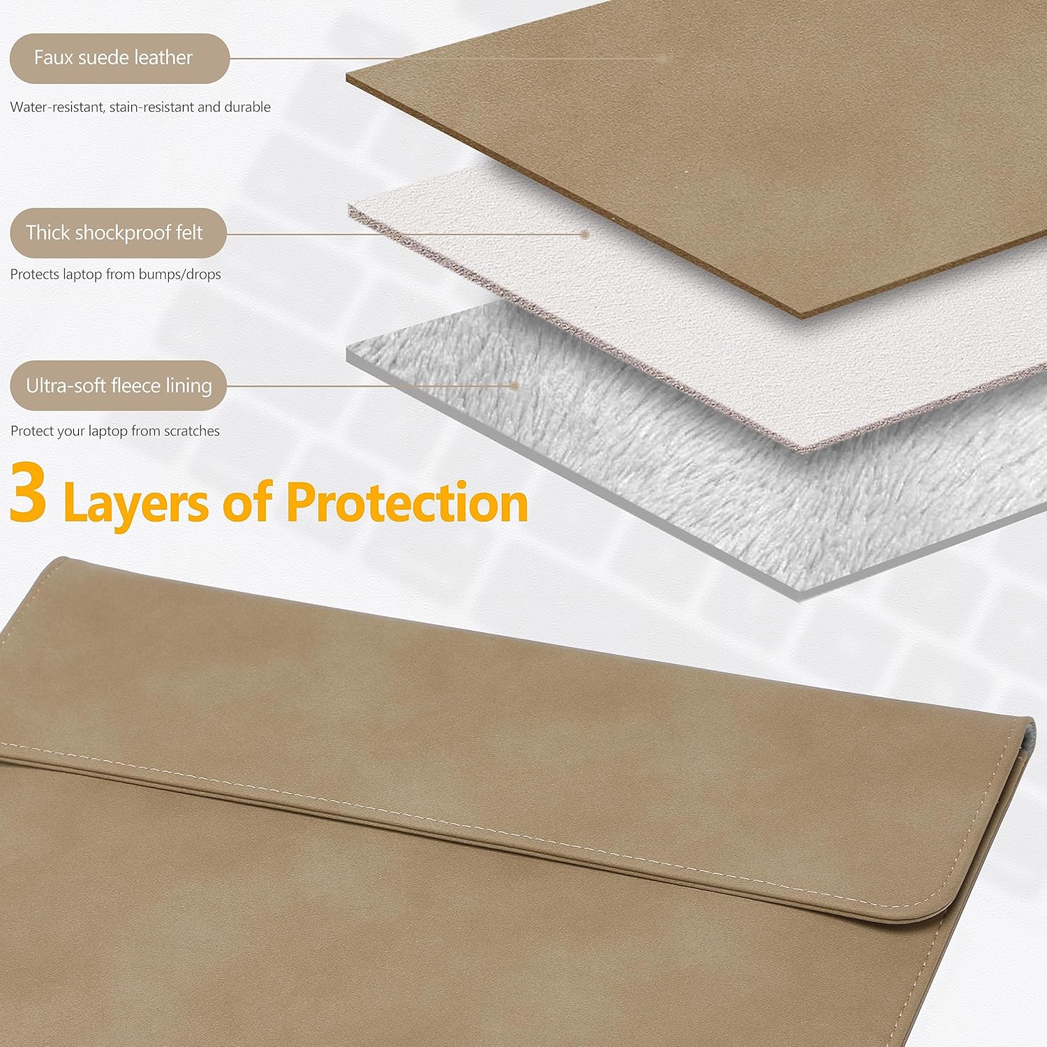 Made of High-strength and durable Microfiber (Faux) Suede Leather, water-resistance, and anti-scratch. Soft velvet lining protects your laptop from scratches when you take it out or put it in the sleeve