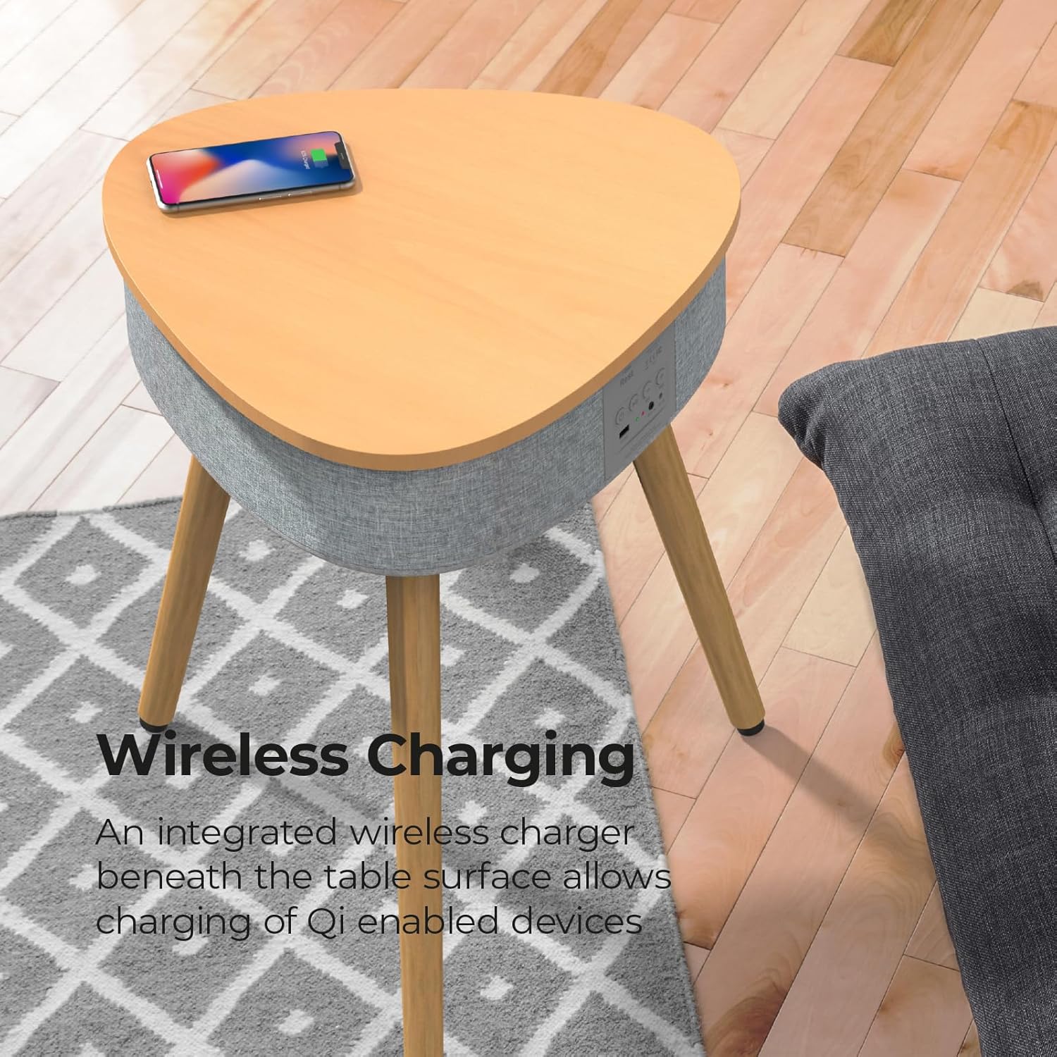 The table is really well designed and fits nicely in my living room. The wireless charging on the table is very convenient and I just need to place my phone in the charging area. I connected the table speaker through bluetooth easily and the sound is really good. I can also move the table around quite easily when I want to. Great product !