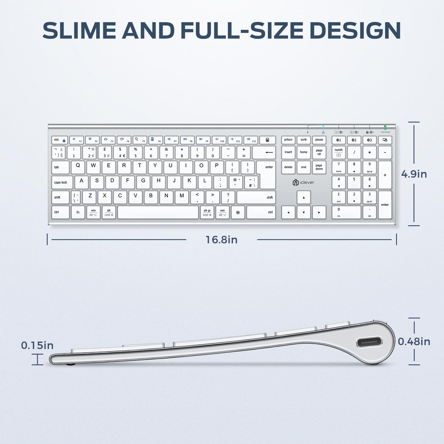 8 reviews for iClever Bluetooth Keyboard, USB-C Rechargeable Wireless Keyboard, Multi-Device Full Size with Numeric Keypad for Mac, Bluetooth 5.1 up to 3 Devices, QWERTY UK Layout, for Laptop/Mac/iMac/Computer/PC