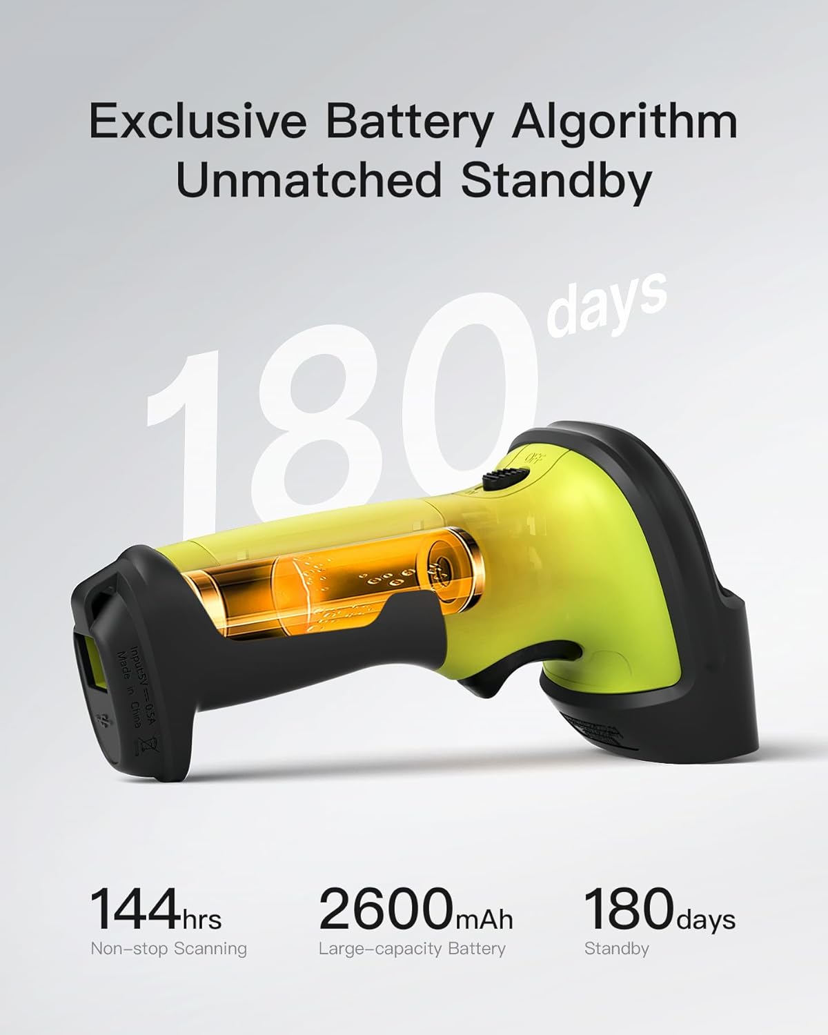 Charging via USB port, battery performance validated by Inateck laboratory algorithms, supports 144 hours of continuous scanning, standby lasts up to 180 days.