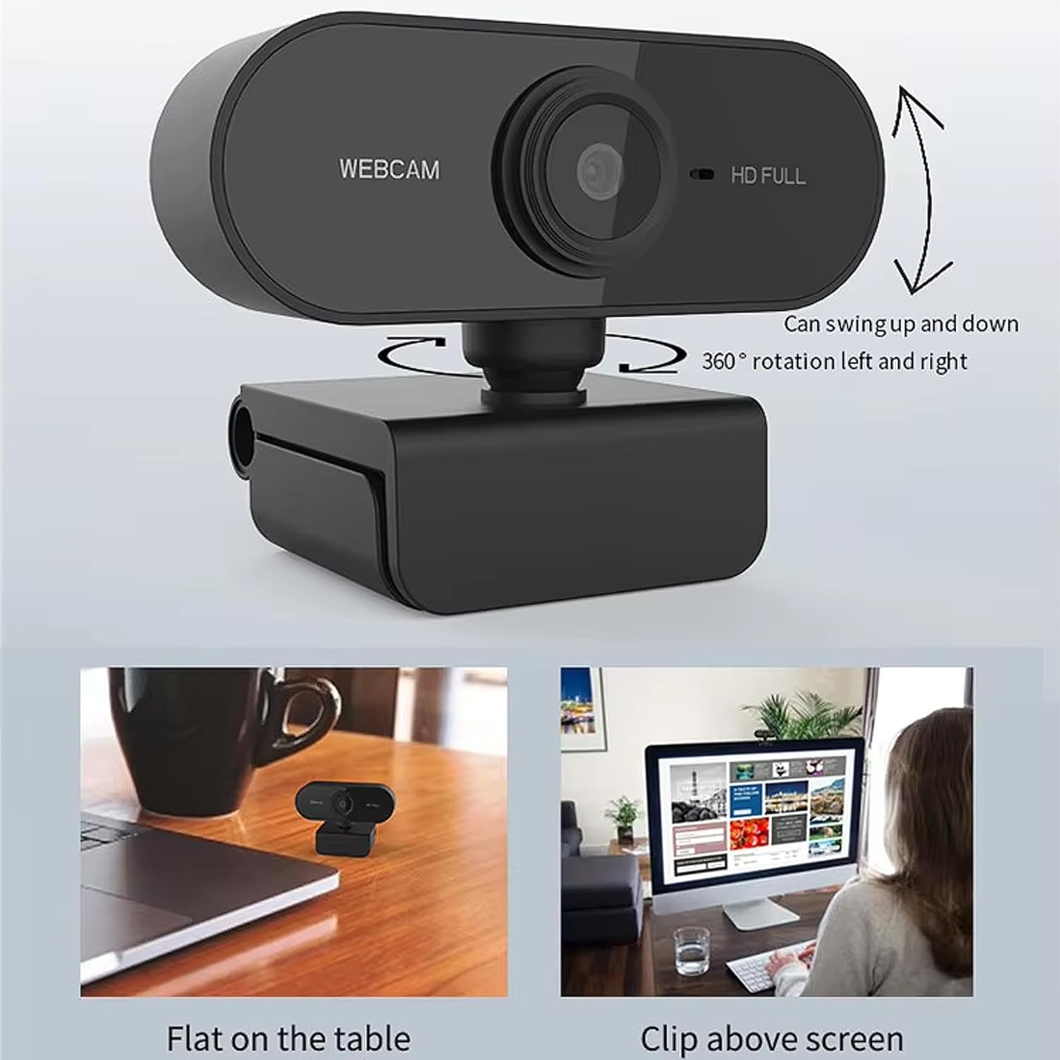 360° Rotation Easy Mount Clamp – Designed for convenience, the HD web camera includes a 360° hinged mount clip that can be mounted on your display or flat on a surface.