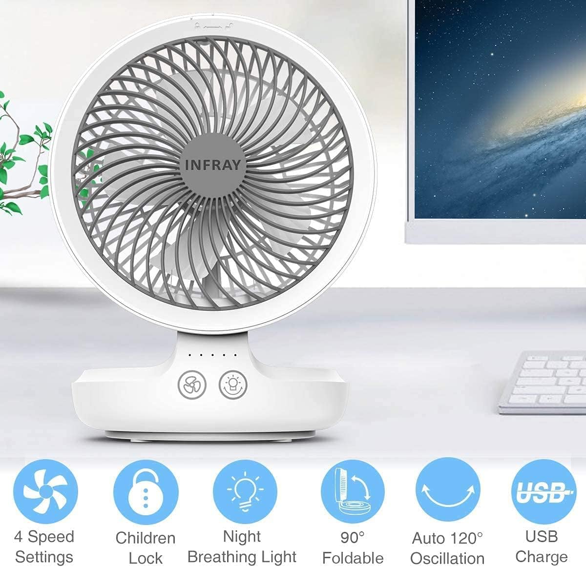 infray USB Desk Fan Rechargeable Portable Oscillating Table Fan with Night Breathing Light, Air Circulator Foldable Quiet Fan Desktop Personal Fan with 4 Speeds Setting for Home Office – White