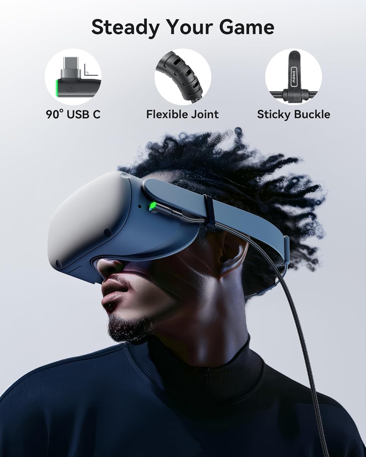 [Steady Your Game Connection] 90° USB-C hooks the VR glasses firmly, a flexible joint that is intact after 45000+ bend tests, plus a sticky buckle to secure the connection, all of these can up your game to the next level.