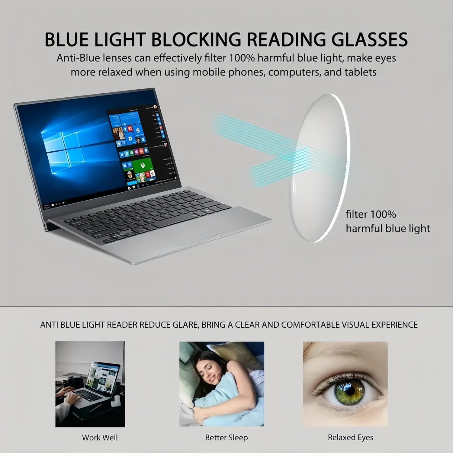 3.In strong light or dim environment,rimless reading glasses can keep your vision clear,fully prevent blue light damage to the eyes.