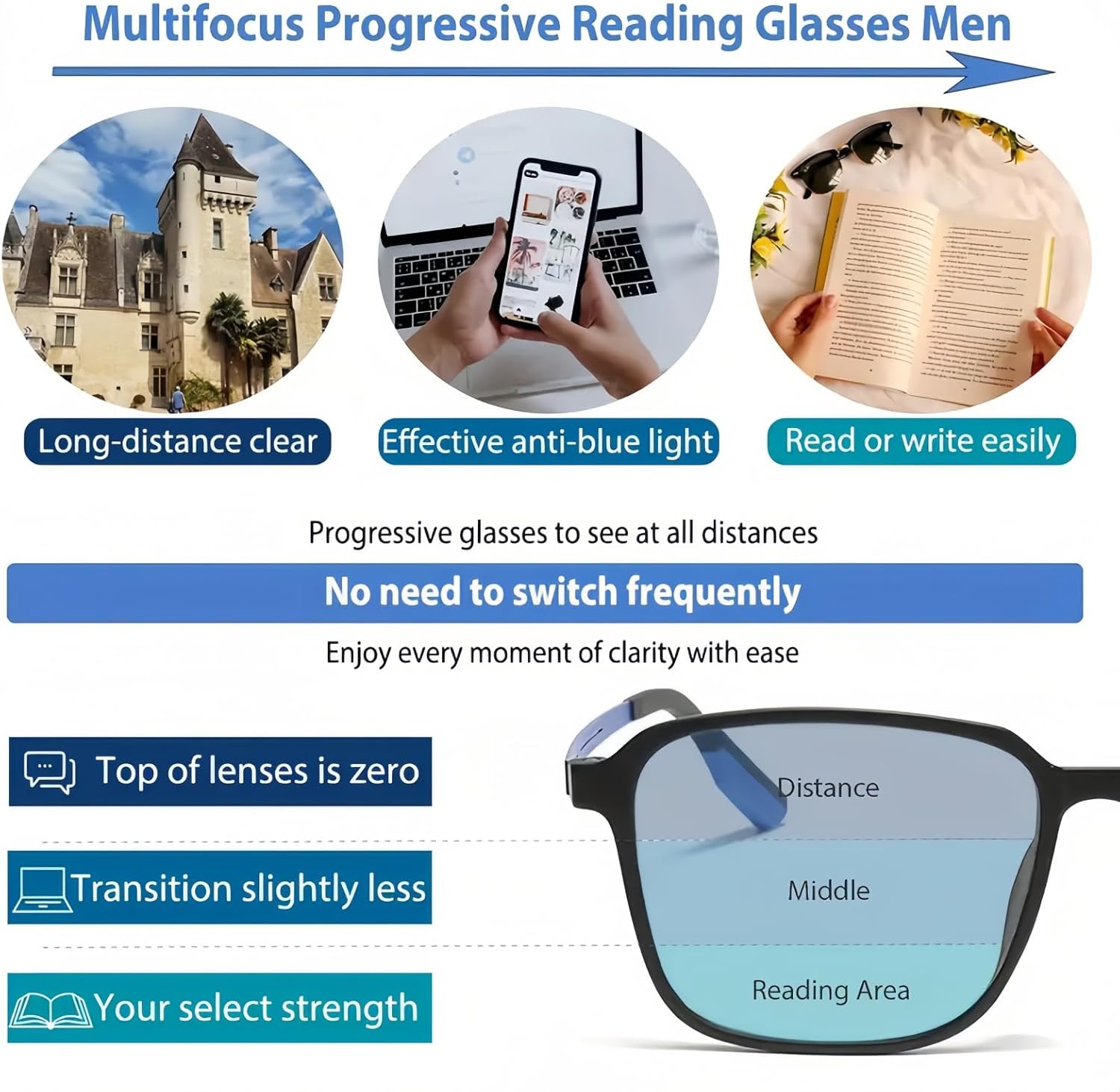 Intelligent Zoom Anti Blue Light Presbyopia Glasses,Photochromic Progressive Multifocus Transition Reading Glasses,Rimless Reading Glasses,Blue Light Glasses,Anti Glare Glasses,Varifocal Glasses Mens