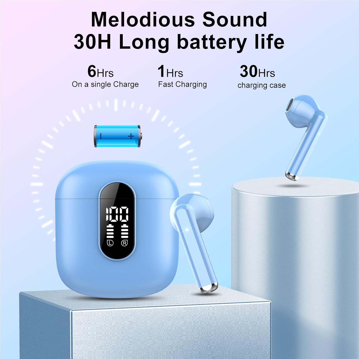 30 Hours Playtime and LED Digital Display: With fast charging Type-C interface, the in ear wireless headphones be fully charged for only need 1 hours. Playtime lasts for over 6 hours from a single charge and a total of 30 hours with the charging case. Features with a smart LED digital display, you can easily know the battery consumption on both wireless bluetooth headphones and the charging case so you can master the time to charge it.