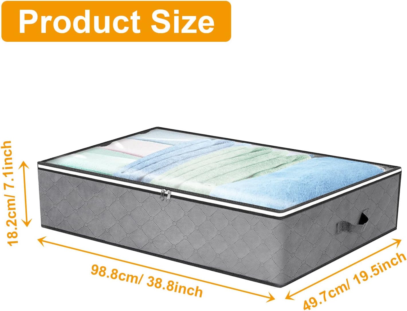 The size of under bed storage box is 100x50x18cm, these storage bags have large capacity and are very suitable for storing quilts, sheets, blankets, pillows, clothes, etc.