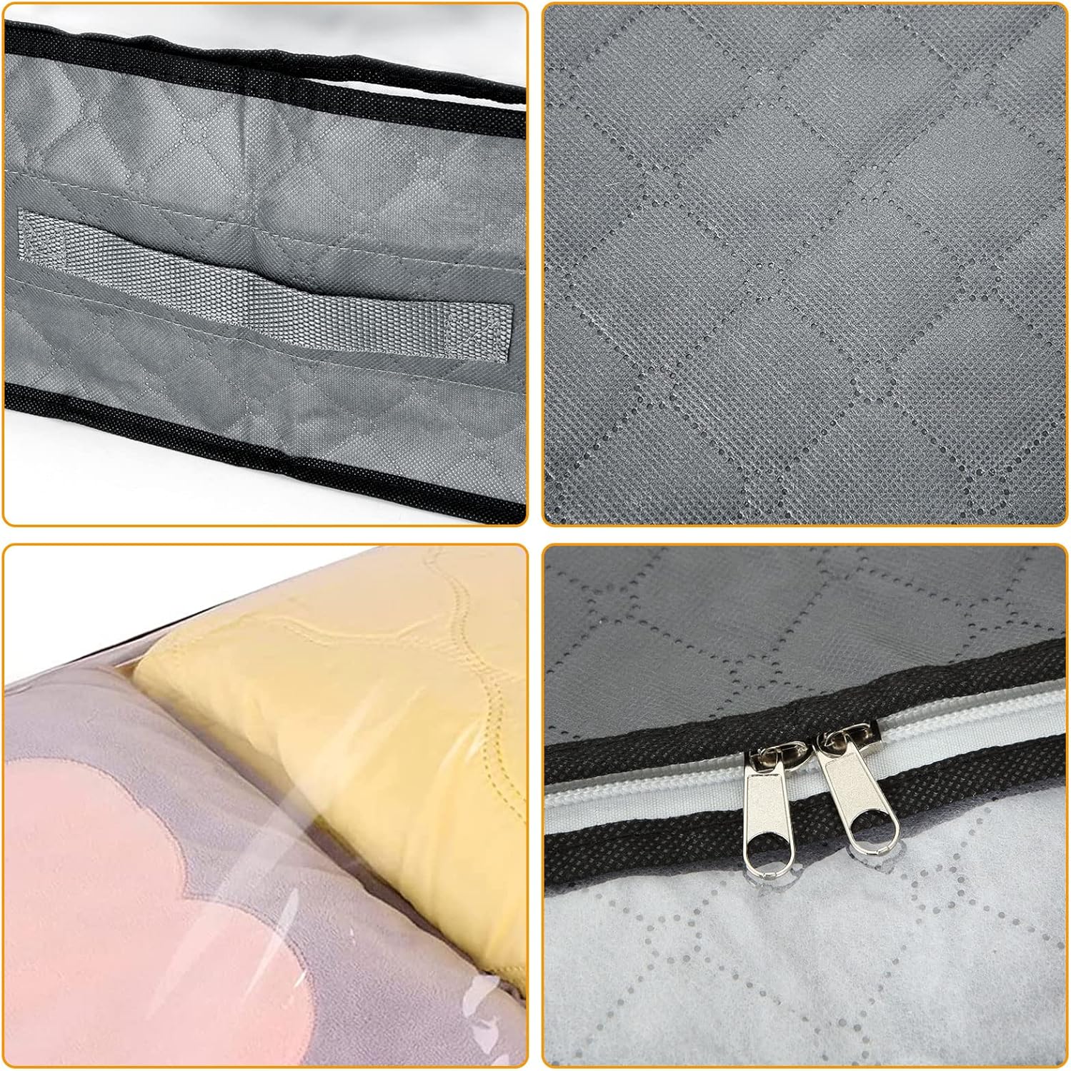Made of three layers of thickened non-woven fabric and PVC window, sturdy and durableEffectively protect your storage items from being clean and tidy, moisture-proof and insect resistantEquipped with handles and solid two-way zipper, making it more convenient for you to useLarge capacity and are very suitable for storing quilts, sheets, blankets, pillows, clothes, etcClear PVC window, can be easy to find stored items, saving time and improving efficiencyWidely use, suitable for wardrobe, bed bottom, attic, basement and travel use