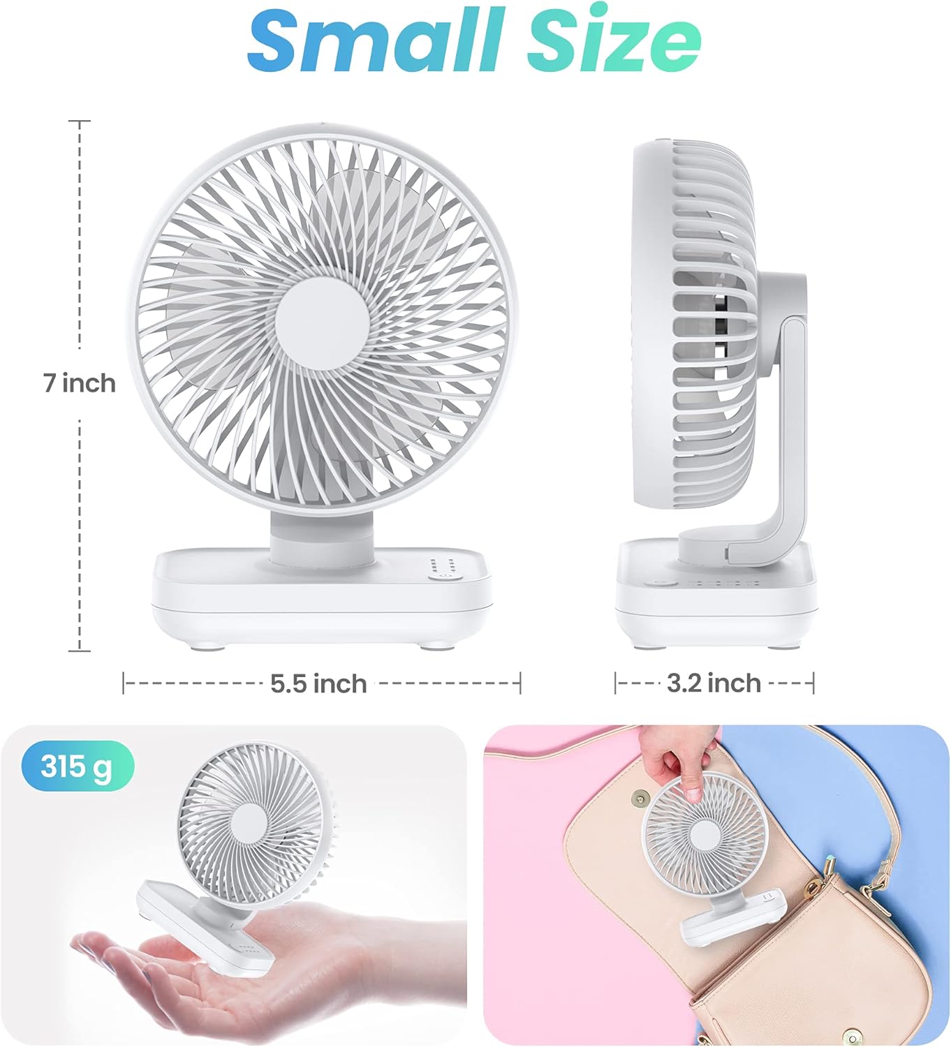 【Portable rechargeble small Fan 】 13.8* 7.5 * 18.3 cm little size and 0.4kg lightweight. This battery fans is easy to pack in a bag when you travel or go out. It will be a good partner for desktop, office, home, dormitory, camping, library or any activity.