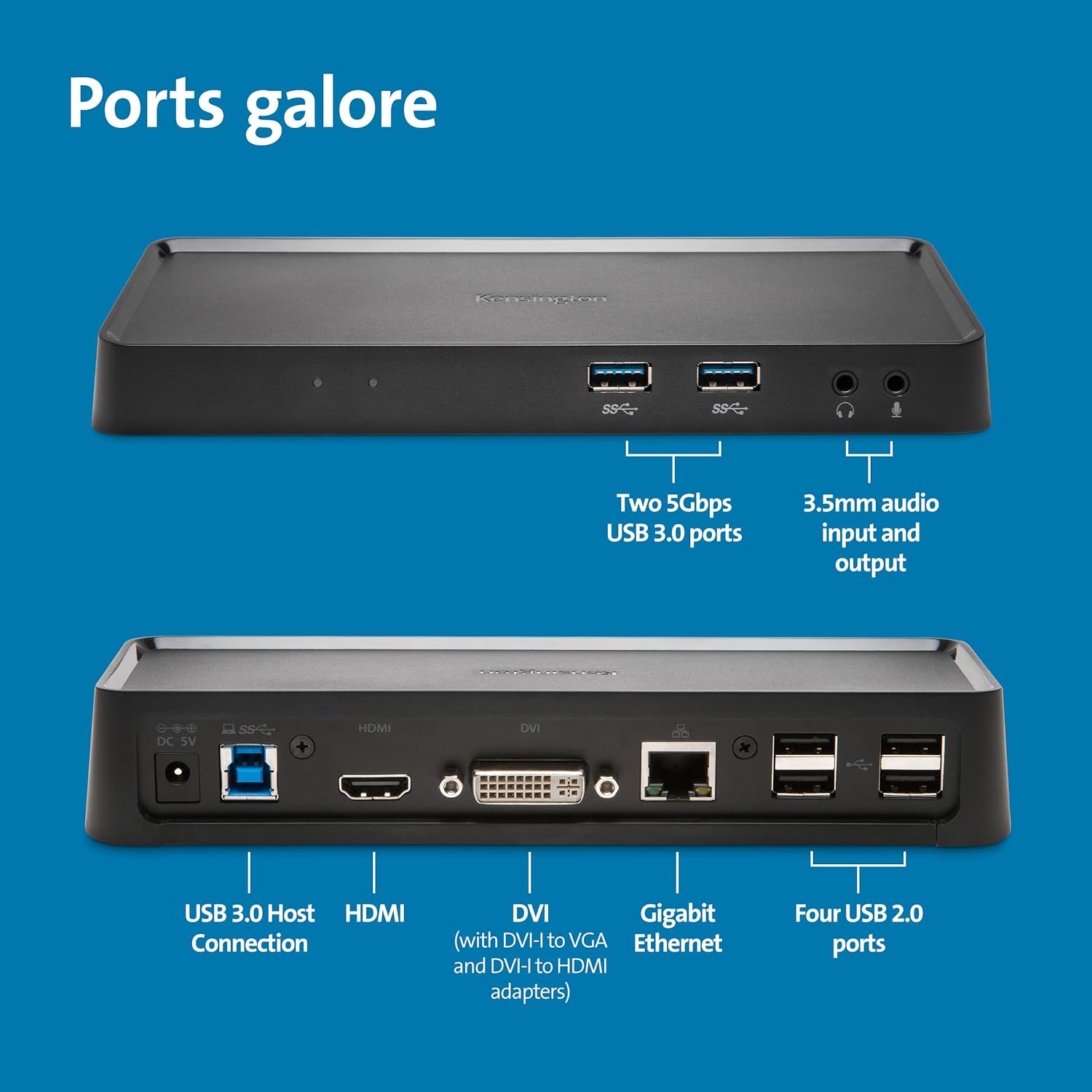 Kensington (SD3600) USB 3.0 Dual Display Universal Laptop Docking Station for Home Office, With HDMI, DVI outputs (includes DVI-VGA + DVI HDMI adapters)