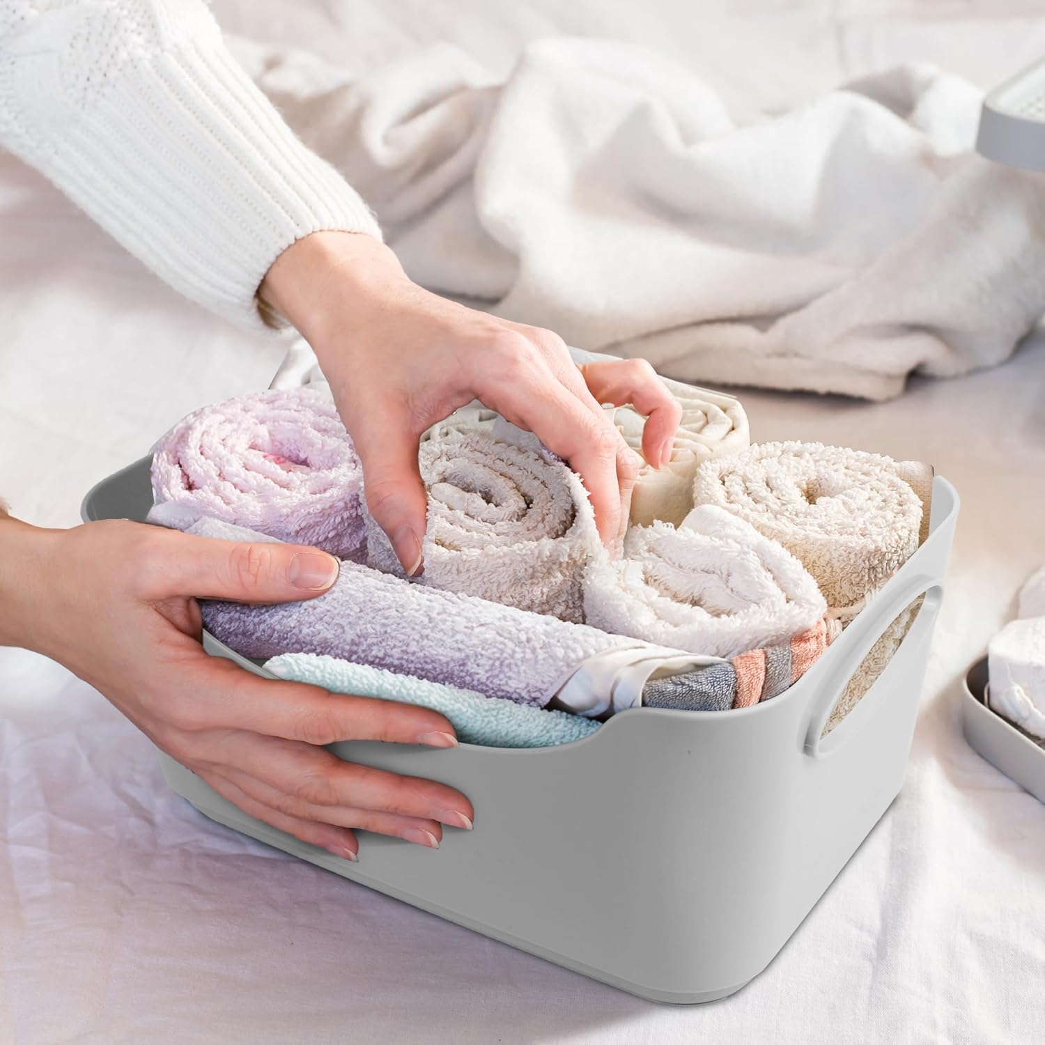 Effortless Mobility: Engineered with integrated handles, these baskets offer unparalleled portability, effortlessly gliding even under a full load. Redefine your space by seamlessly rearranging and decluttering, thanks to the ease of relocating these stylish baskets.