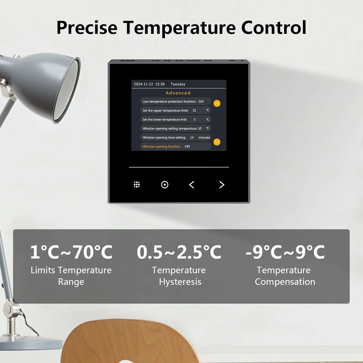 【High Accuracy】Temperature display accuracy: 0.5℃, temperature setting range: 1℃ ~ 70℃ (default setting: 5℃ ~ 35℃). The thermostat KTF0187A is equipped with a dual sensor system, with an integrated temperature sensor for accurate measurement of the control air temperature and external temperature sensor for overheating protection of the floor.