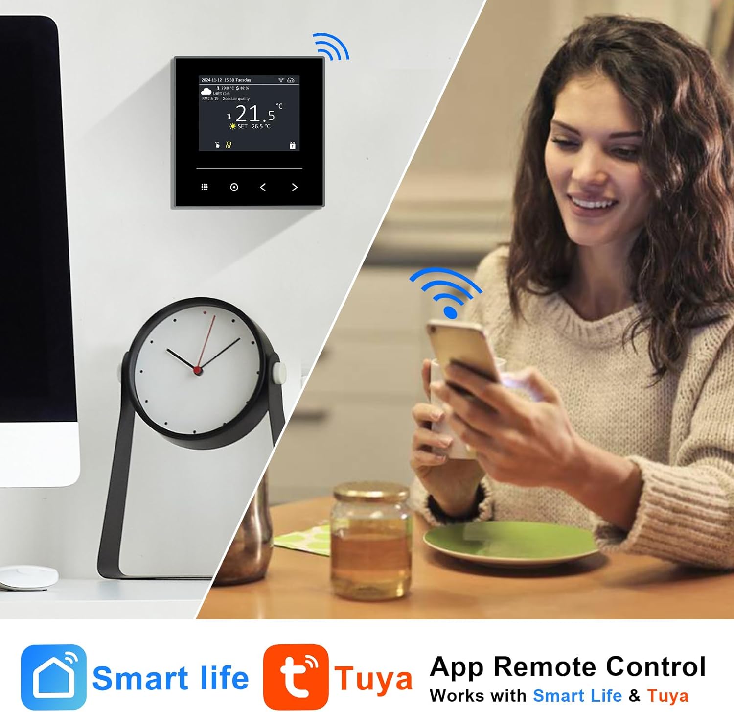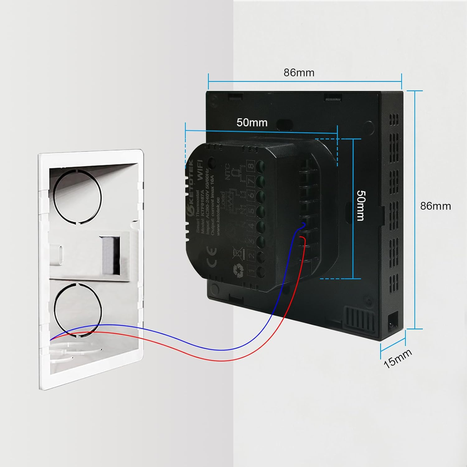 【Smart Electric Underfloor Heating Thermostat】KTF0187A is a Wi-Fi-enabled thermostat for electric underfloor heating compatible with Alexa, Smart life, Tuya App. Download the app to set parameters and control the thermostat from your mobile phone anytime, anywhere. It can also be controlled via Alexa voice commands. WLAN with 2.4 GHz is required.