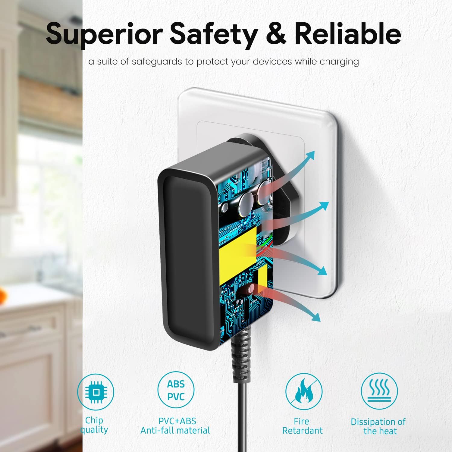 Over-voltage/ Over-current/ Over-temperature protections, These protections ensure circuit components always work in the safe range, thus greatly improving the service life of the power adapter charger