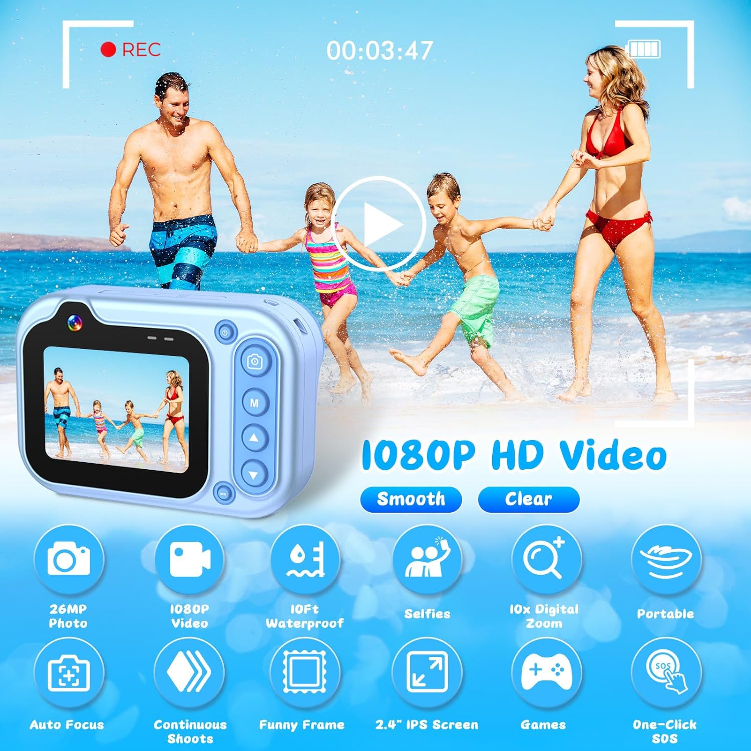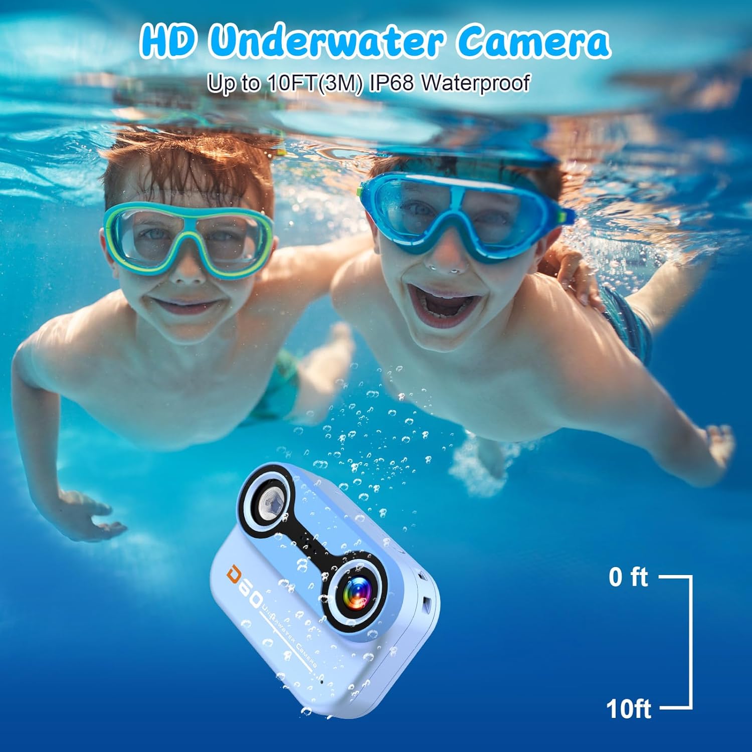 Kids Camera Waterproof, 10FT/3M Underwater Camera for Kids 48MP 1080P HD 10X Digital Zoom with 2.4″ IPS Screen, Children Digital Action Camera with 32GB Card