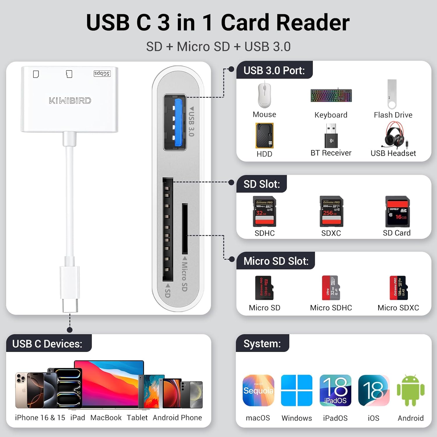 Plug & Play: Reads and writes either SD or Micro SD card and USB-A device simultaneously. Compatible with Windows 2000/XP/Vista(SP2)/7(SP1)/8/8.1/10(32/64-bit)/11, MacOS Sequoia, iPadOS 18/17/16, iOS 18/17, Android 15, Chrome OS, Linux, Ubuntu.