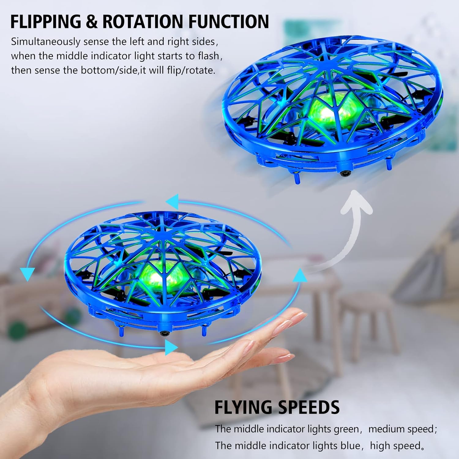Gesture control: when your hand is nearby, the drone can fly in the opposite direction. You can control it with your hands in the air to play interactive games, get super cool and enjoy super fun! UFO has five sensors that allow children to play happily with other children