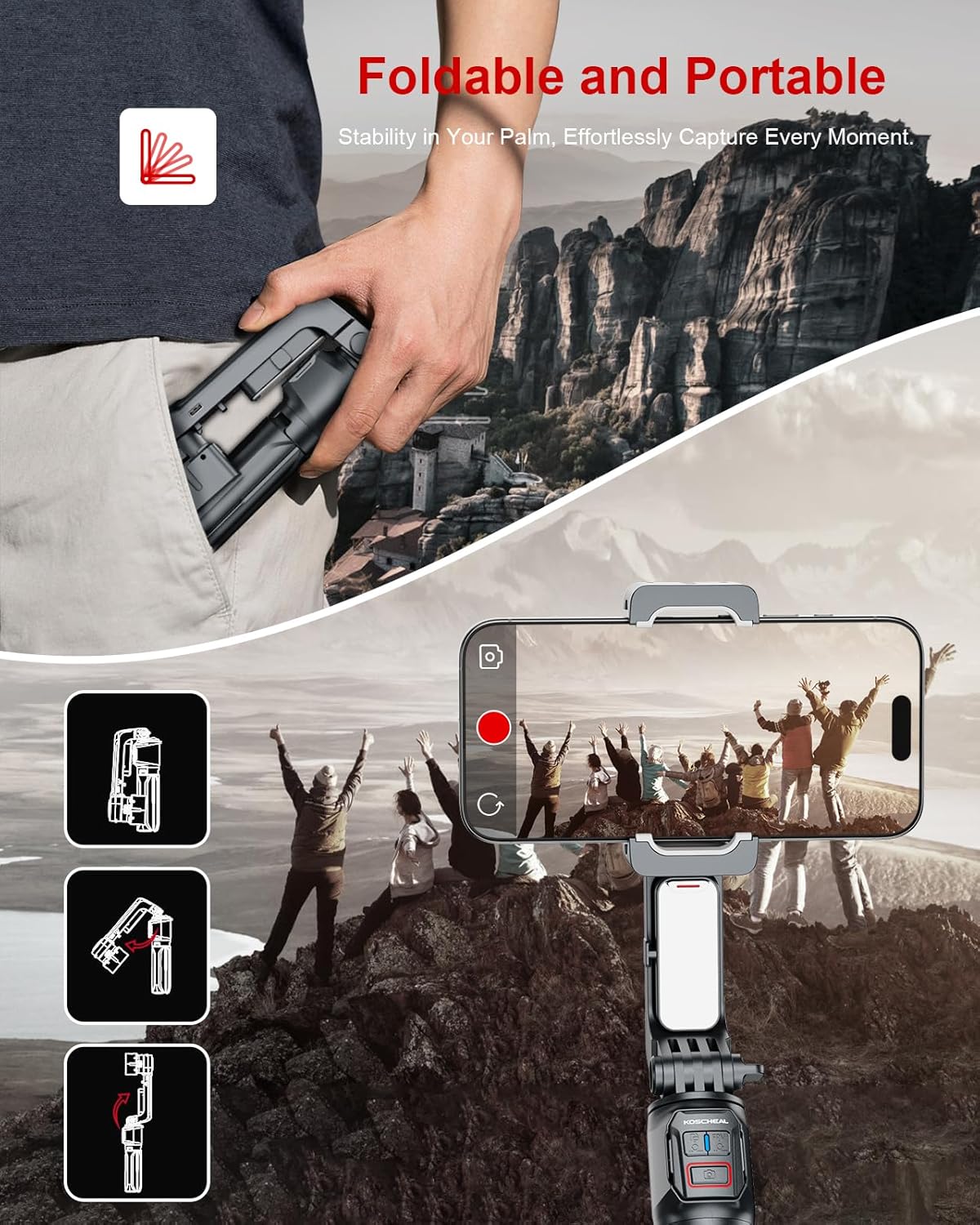【Extra Long Standby & Portable Stabilization】This mobile phone stabilizer boasts an impressive 12-hour standby time and 6- hour of continuous use on just a 2.5-hour charge. Powered by polymer batteries, it ensures safety and reliability, with a convenient power indicator to keep you informed. Crafted from high-quality ABS and aluminum alloy, the KOSCHEAL stabilizer is lightweight at just 0.63lb and folds to a compact 6.5*3.4*2.5 inches. Whether you’re filming, traveling, or exploring outdoors, this stabilizer is your reliable companion day and night.