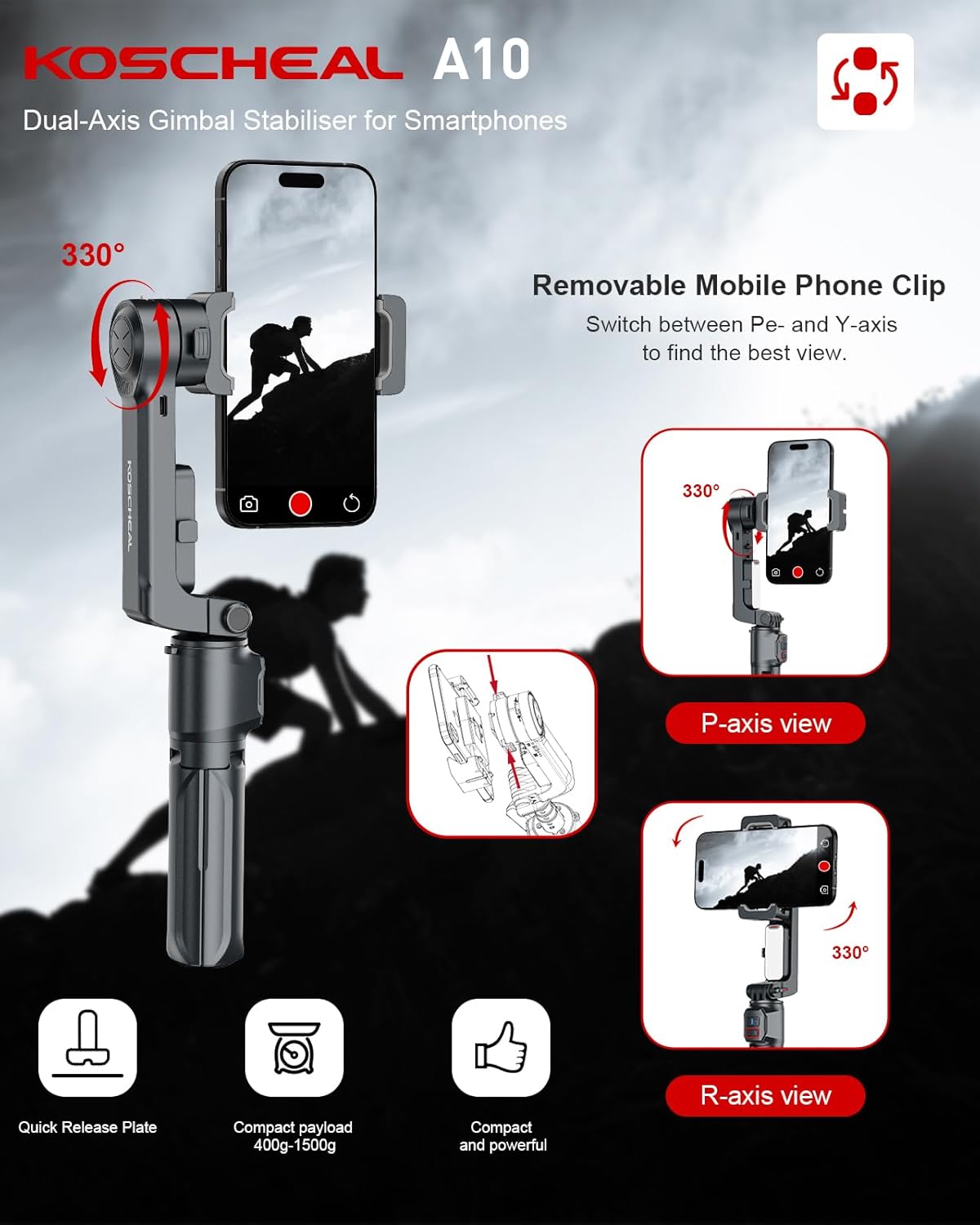 【Intelligent Gimbal Phone Stabilizer】KOSCHEAL gimbal stabilizer adopts advanced in-built anti-shake technology with dual-axis anti-shake motors, the mobile phone gimbal clamps on the R-axis to address the horizontal anti-shake motion, and on the P-axis to address the longitudinal anti-shake motion, to capture moments of excitement with cinematic smoothness.Ideal for VLOGs, Live Video, Youtube, Tiktok, live streaming, and action cameras.R-axis and P-axis switching by adjusting the collet without removing the phone.