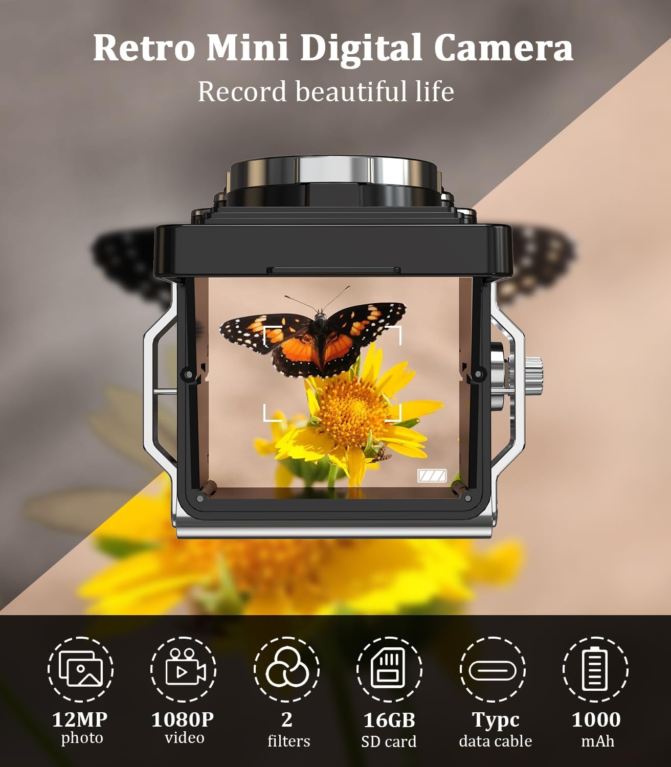 Kriogor Retro Mini Digital Camera, 1080P FHD 12MP Retro Digital Twin-Lens Camera, 1.54″ Compact Cameras with Digital Zoom, Portable Canera for Teens Students Kids Boys Girls, 16GB Card