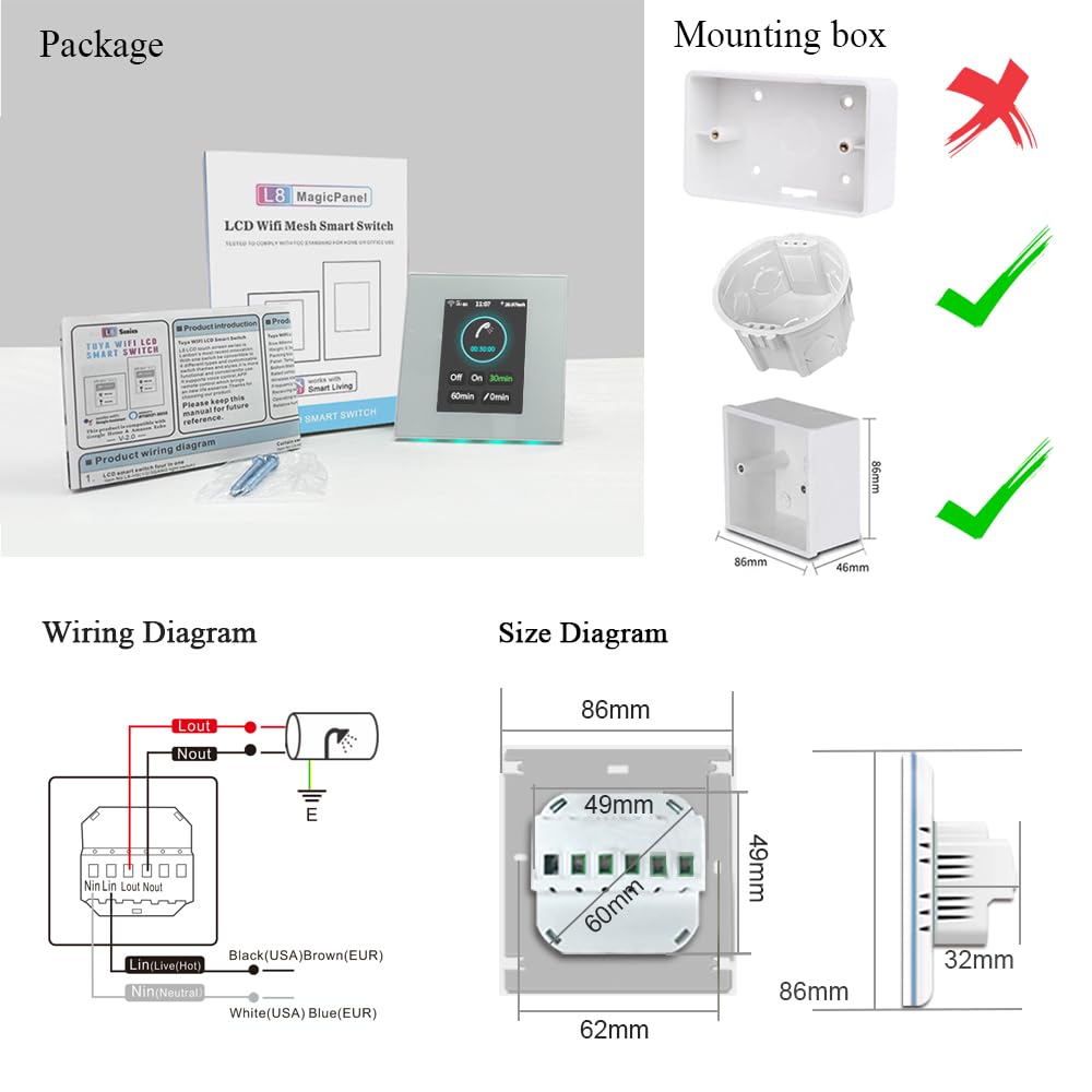 Switch LCD panel size: 8.6*8.6*1cmSwitch base size: 4.9*4.9*3.2cm