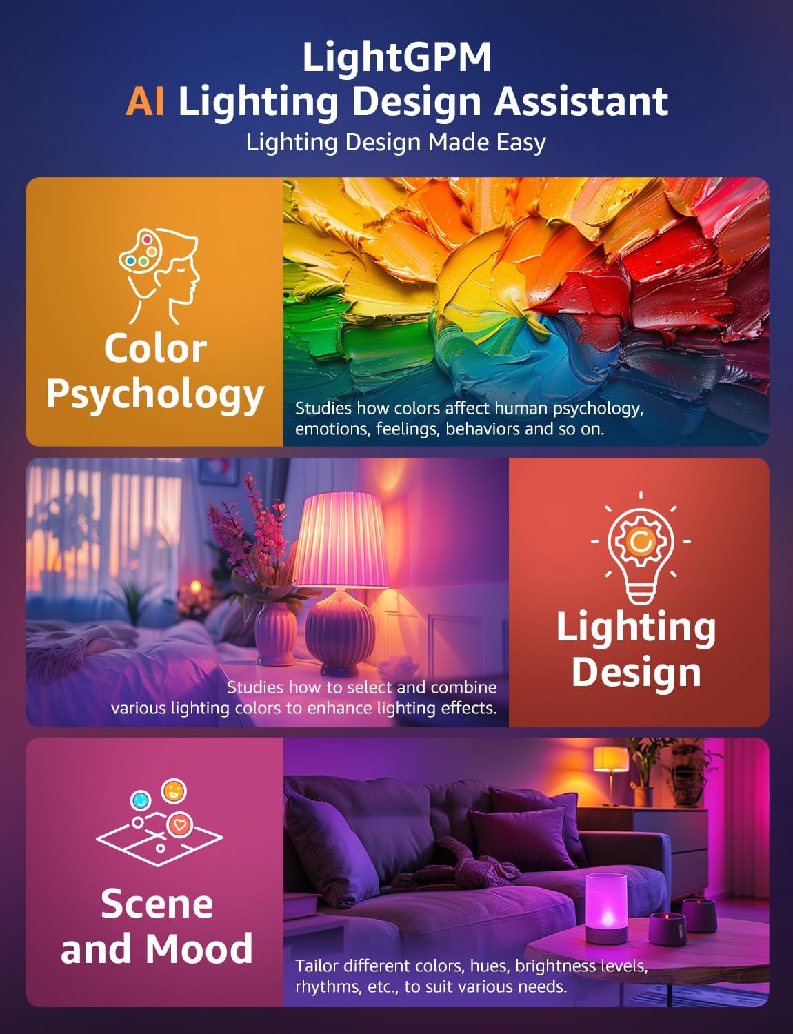 [LightGPM AI Lighting Design Assistant-Lighting Design Made Easy] – Lepro B1 smart bulb adopts the LightGPM AI algorithm, a large language model trained by color psychology and lighting design knowledge, allowing you to create professional lighting effects without learning these skills. (Note: Requires downloading the Lepro app and is not compatible with LampUX or Smart Life app.)