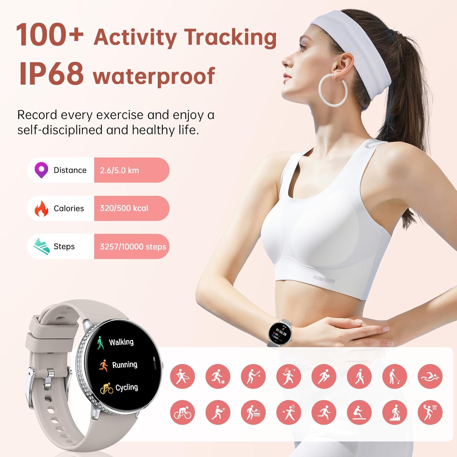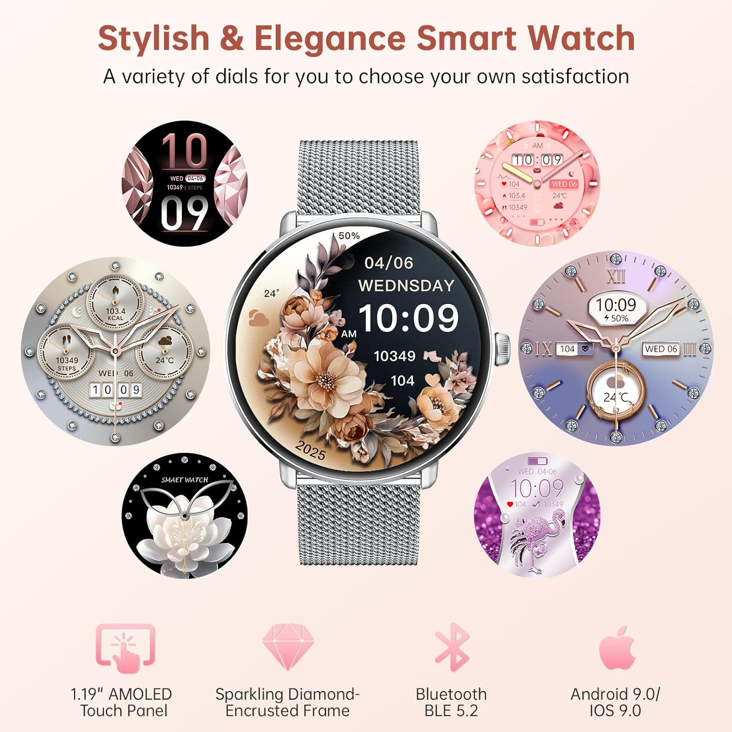 1.19″ AMOLED and Custom Dials: This Women’s smartwatch features a 1.19-inch HD AMOLED touchscreen with stunning clarity, smooth and scratch-resistant surface. In addition, there are more than 160 watch face styles are optional, and you can also upload photos according to your own preferences for personal customization. fitness tracker watch