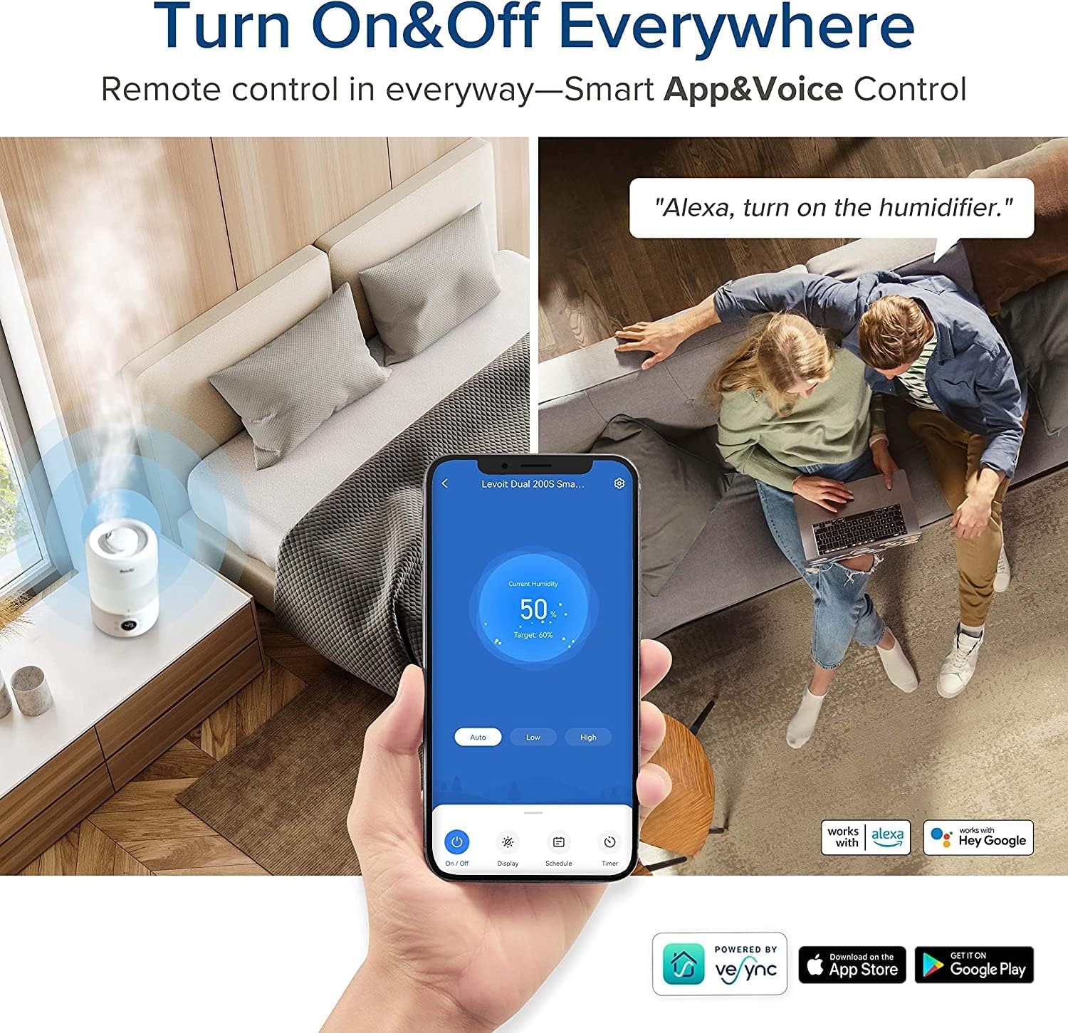 USEFUL SMART CONTROL Do you have to touch the button or the remote control at a limited distance to operate the humidifier? With the free VeSync app, you can adjust the humidity in your home anytime, anywhere and set schedules that suit your daily routine; voice control (Alexa and Google Assistant) frees your hands directly, all you need to do is say to enjoy the most appropriate humidity