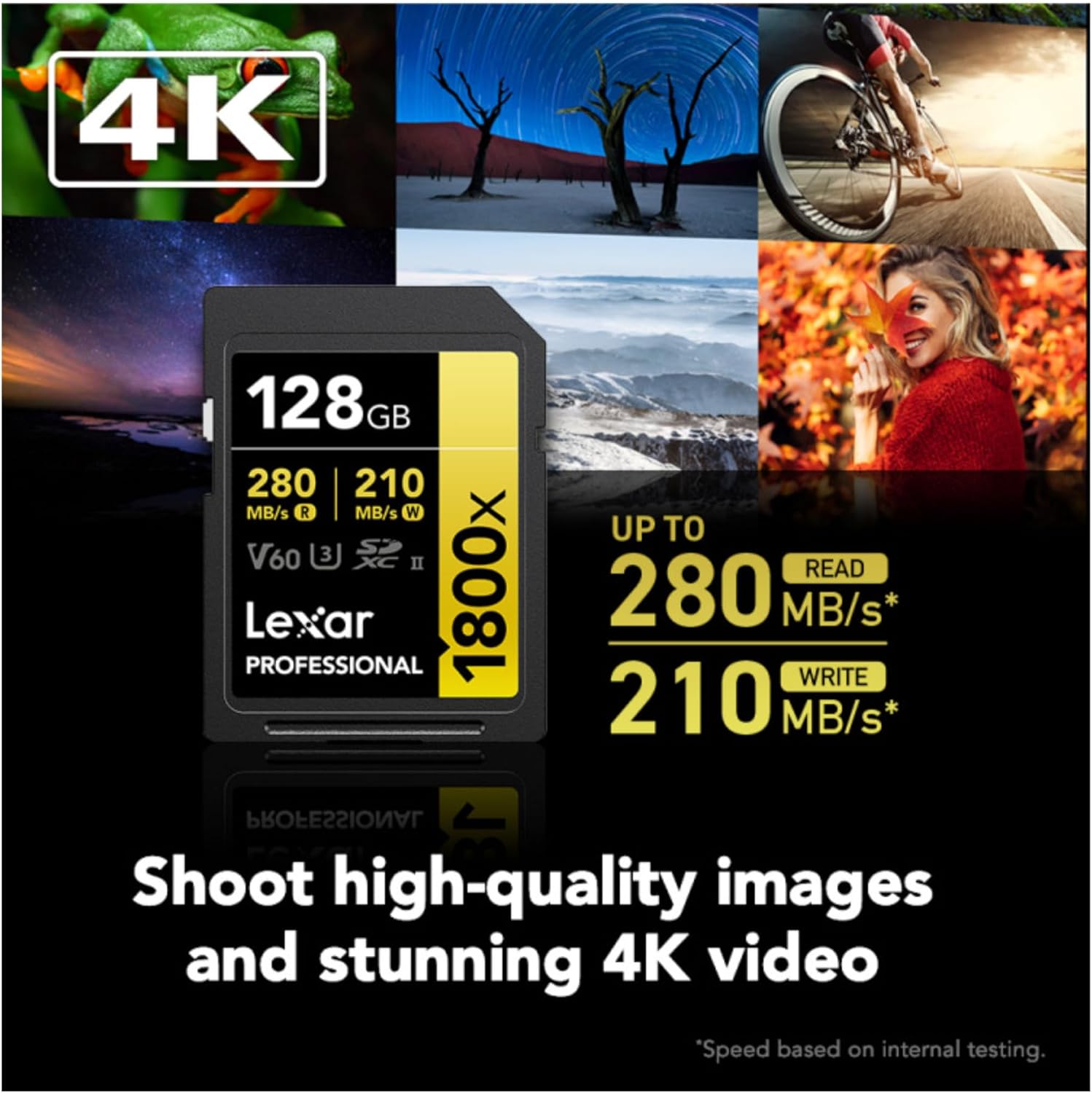 Lexar 128GB Professional 1800x UHS-II SDXC V60 Rated 4K Video Capture Memory Card (GOLD Series)