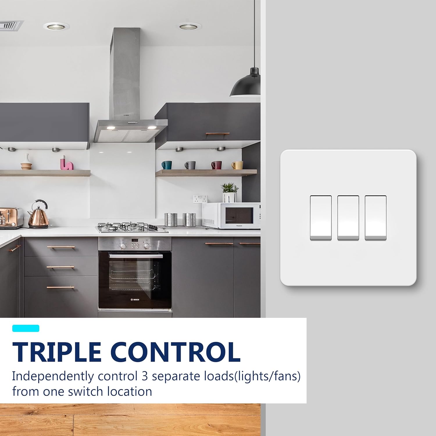 6 reviews for LIDER 3-Gang Screwless Light Switch, 1-Way/2-Way, UKCA Certified, Plastic Screwless Faceplate, RoHS Compliant, Heat & Fade Resistant, Round Edges, 16A, Glossy Finish, White