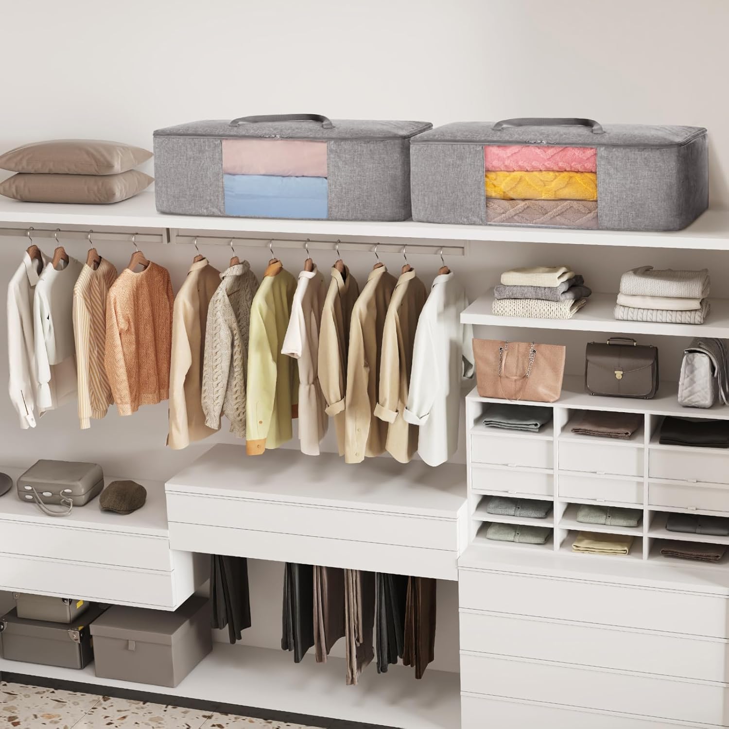 I found these storage bags useful for organising bulky items such as duvets and winter bedding. The capacity is generous, comfortably accommodating a full king-size duvet with room for additional items. The clear window allows you to see the contents easily without rummaging, which is particularly convenient as we store them under the bed.The material seems robust and can be wiped clean if needed. That said, the zips can be a little fiddly when the bag is tightly packed. The reinforced handles appear strong enough but likely arenât suitable for frequent lifting when the bag is fully loaded.When theyâre not in use, we fold them and tuck them away in a drawer, which suits our smaller London home well. Theyâre practical for seasonal wardrobe changes but might not hold up under regular, heavy-duty use.