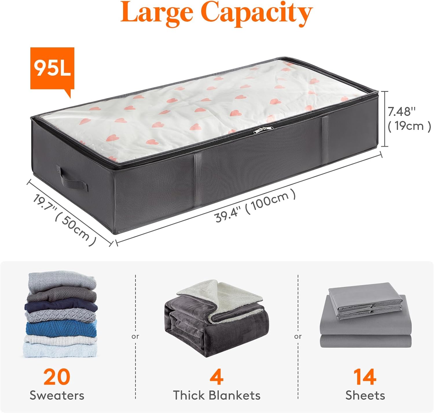 Large Capacity: This under bed storage bag measures 100cm x 50cmx 19cm and has a capacity of 95L which can easily hold 20 sweaters, 4 thick blankets and 14 sheets. Ideal for under-bed storage, closet or shelves.