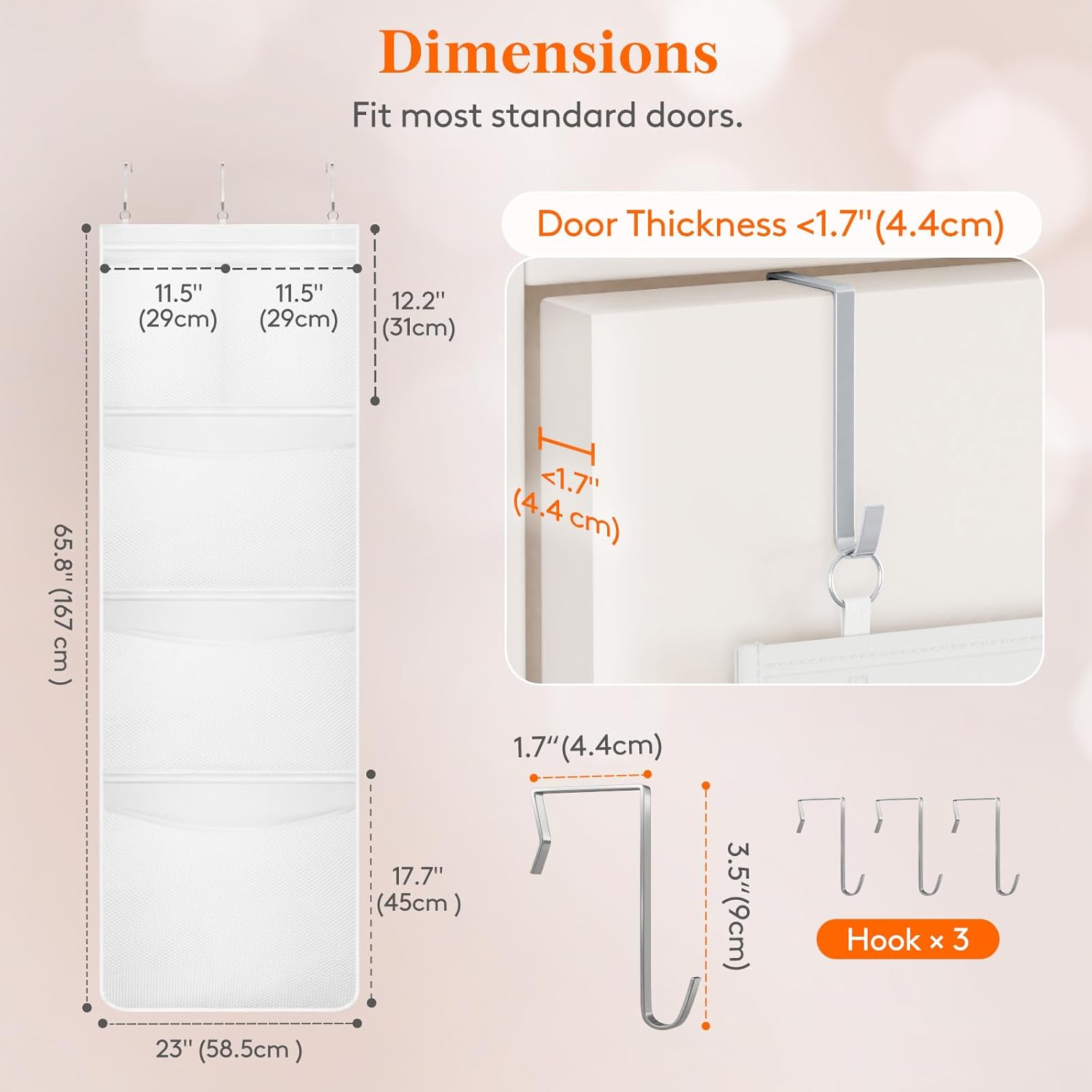The organizer is equipped with 3 sturdy metal hooks that ensure a secure hold. It fits most doors and does not interfere with closing (suitable for standard home doors up to 1.7″ /4.4 cm thick).