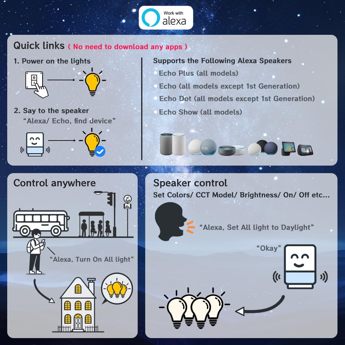 Work with Alexa: Support one step pairing, just say “find device” to the speaker after turning on the lights. Voice command enables you to set the color temperature ( warm white / soft white / white / daylight white / cool white ), 15 RGB colors, 1-100% brightness levels, and turning the lights on and off. You can also remotely control these lights from anywhere via the Alexa APP.