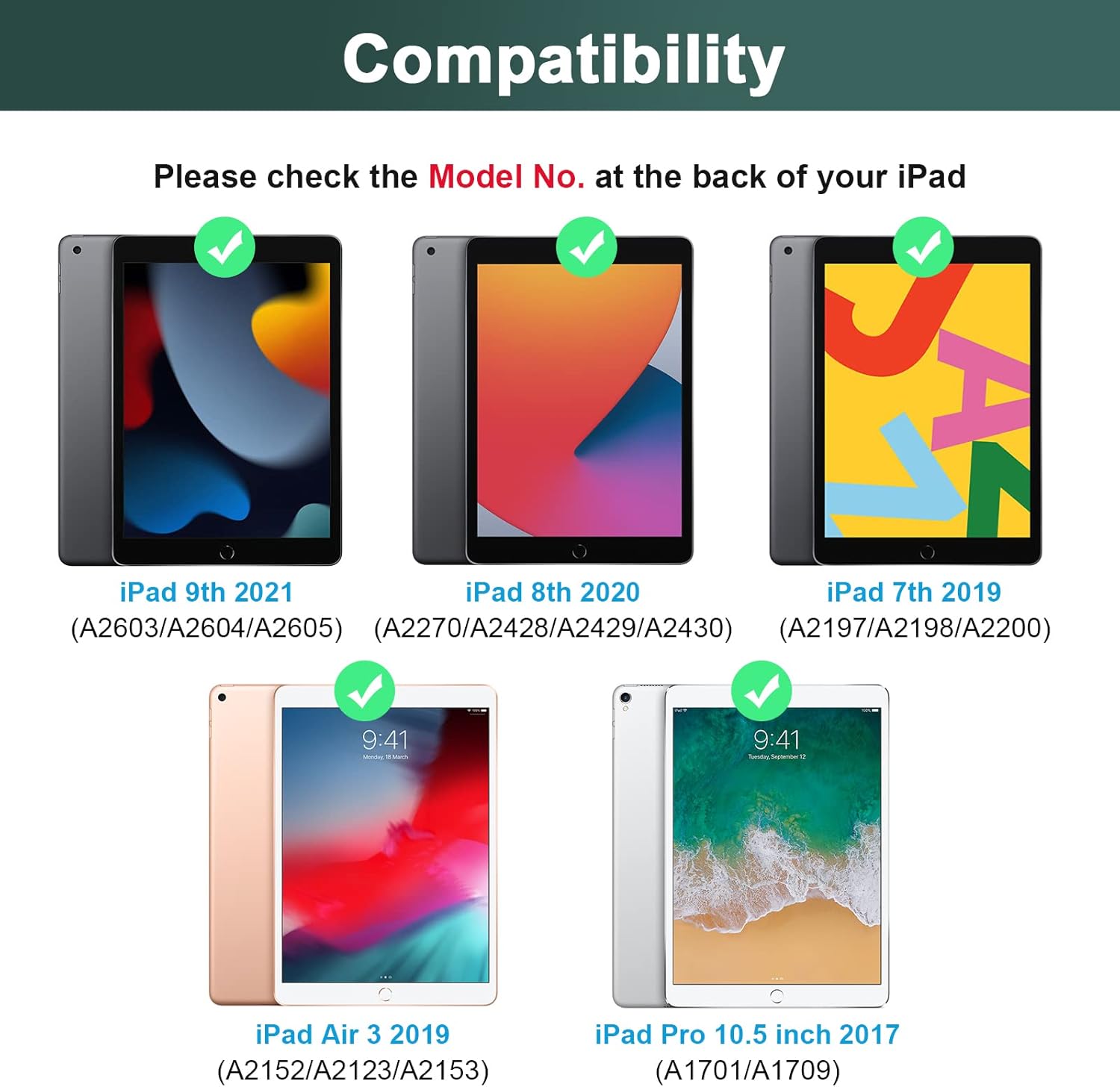 Keyboard Case Compatibility: The case is designed for the latest iPad 9th 2021 (A2603/A2604/A2605),2020 iPad 8th genneration (A2270/A2428/A2429/A2430) / iPad 7th generation 10.2 inch 2019 (A2197/A2198/A2200), iPad Air 3 2019 (A2152/A2123/A2153), iPad Pro 10.5 inch 2017 (A1701/A1709). Not compatible with any other iPad models. ✘ Reminds: Please check the “Axxxx” logo on the back of the iPad before purchasing.