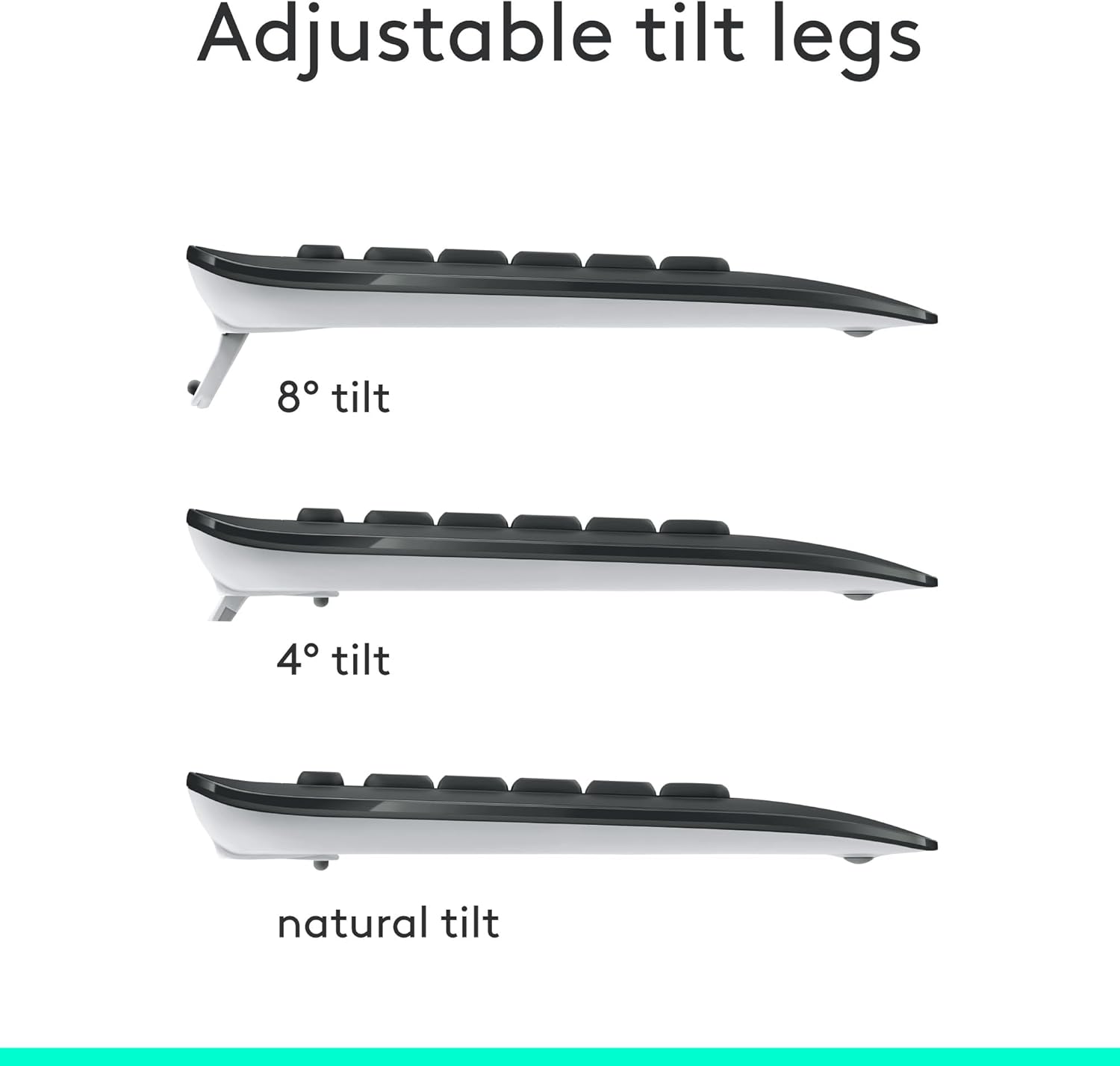 Precision Typing: An instantly familiar experience, type with ease and comfort on this full-size wireless keyboard, featuring reduced noise, palm rest, spill-resistant design (1), adjustable tilt legs