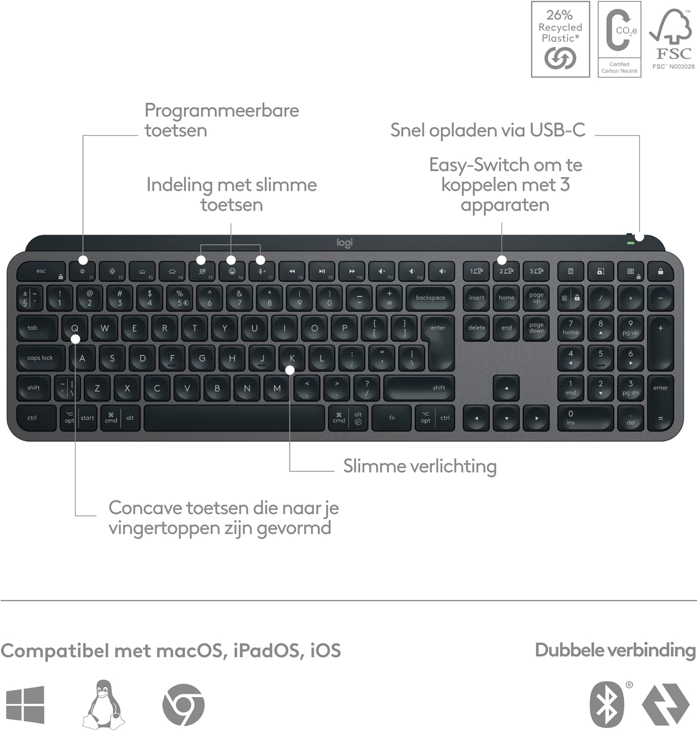 Logitech MX Keys S PLUS Wireless Keyboard, Low Profile, Fluid Quiet Typing, Programmable Keys, Backlighting, Bluetooth, USB C Rechargeable, Windows PC, Linux, Chrome, Mac, QWERTY UK English – Graphite