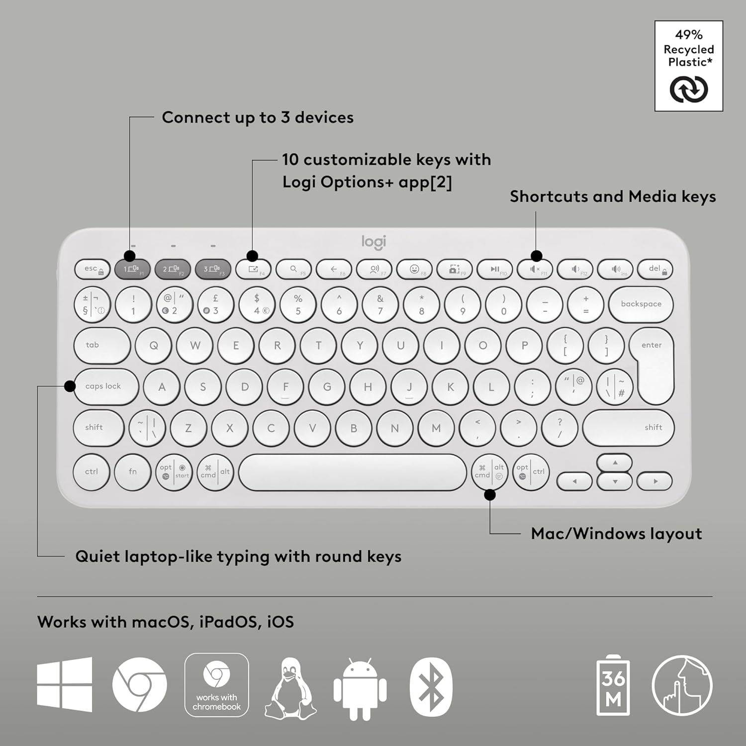 Logitech Pebble Keys 2 K380s, Multi-Device Bluetooth Wireless Keyboard with Customisable Shortcuts,Slim and Portable, Easy-Switch for Windows/macOS/iPadOS/Android/Chrome OS, QWERTY UK Layout, White