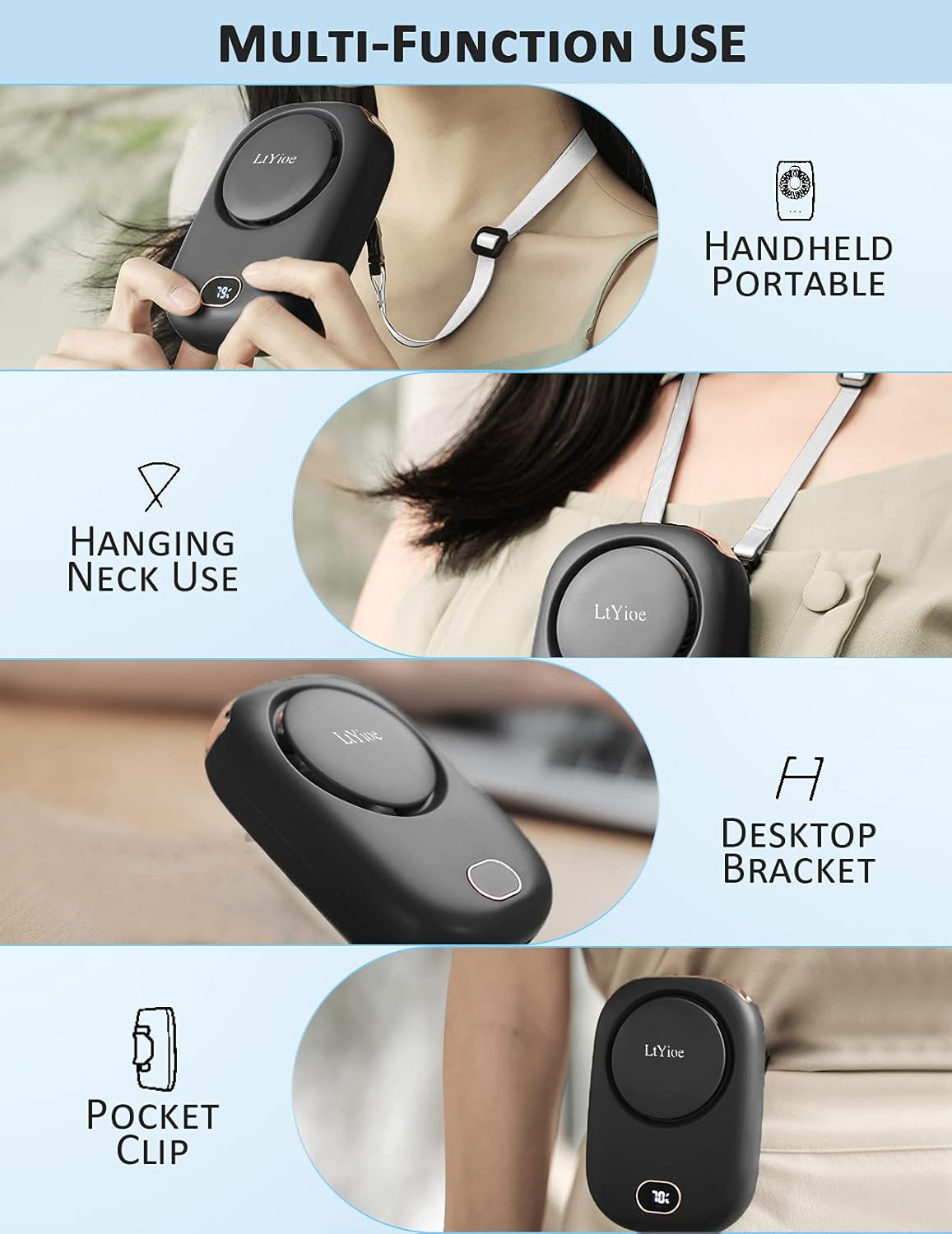 【MULTIFUNCTIONAL USE】The small personal fan has an adjustable back stand that supports tilting on the table, the adjustable rope can hang around the neck, also hold in your hand, or clip on your pocket, you can use it in many ways. Package list: 1 LtYioe Mini Portable Handheld Fan;1 USB Cable;1 User instruction; 1 Adjustable Rope; 1-year warranty service.