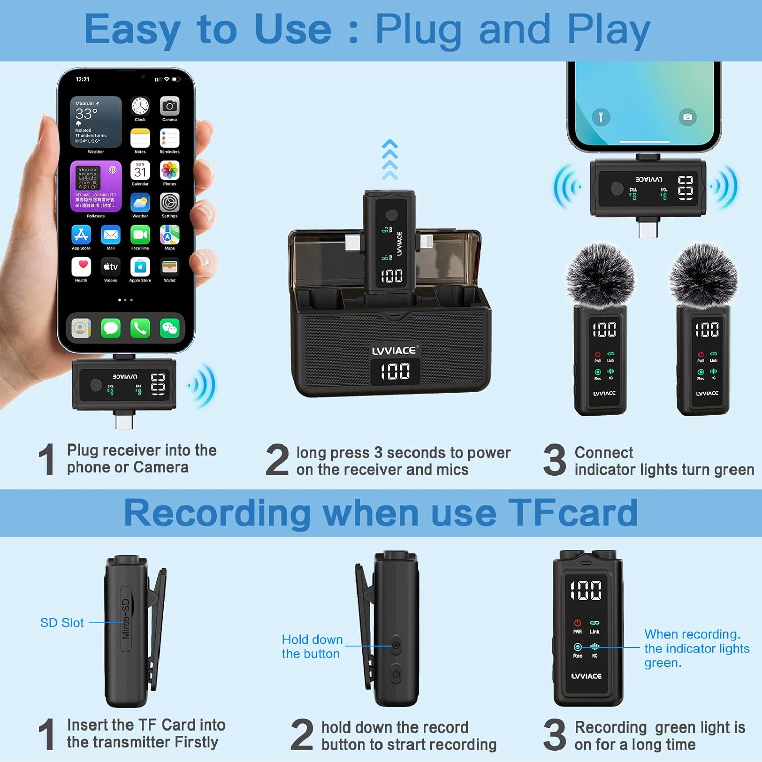 Easy to Use: LVVIACE wireless microphone is easier to set up. No adapter, bluetooth or app required,simply press and hold the receiver on/off button and then plug the receiver (Lightning/TYPE-C/3.5 mm connector) into the device.and turn on the portable microphone and the two parts will pair automatically.Equipped with a TF card port, you can also use a TF card for recording storage. Note: the transmitter supports up to 32G TF cards.