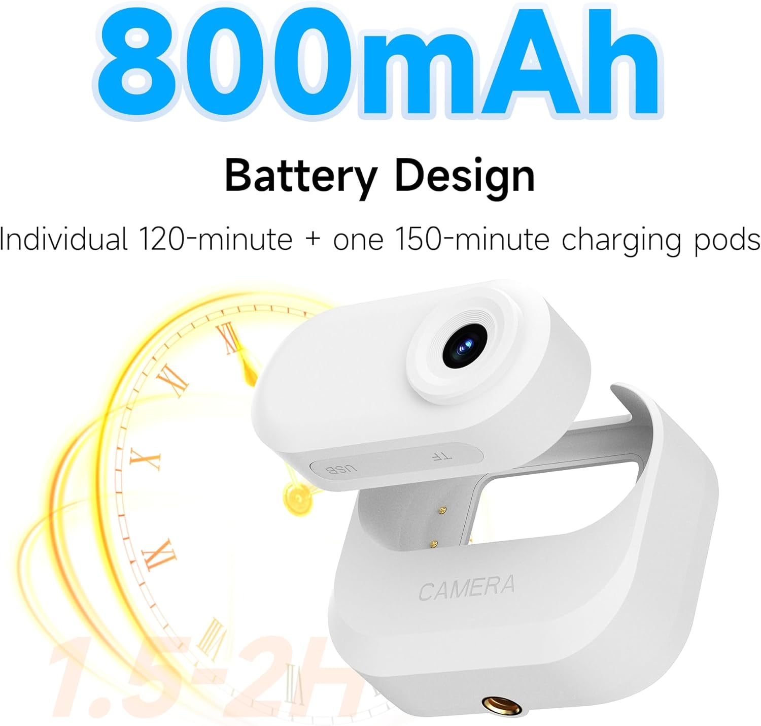 The mini camcorder is equipped with an 800mAh rechargeable lithium-ion battery. It can record continuously for up to 150 minutes in 1080P mode. In addition, this body camera also supports recording while charging, which can meet your uninterrupted long-term recording needs The charging capsule can add 150min+ to the usage time, so that we can use it for a longer period of time.