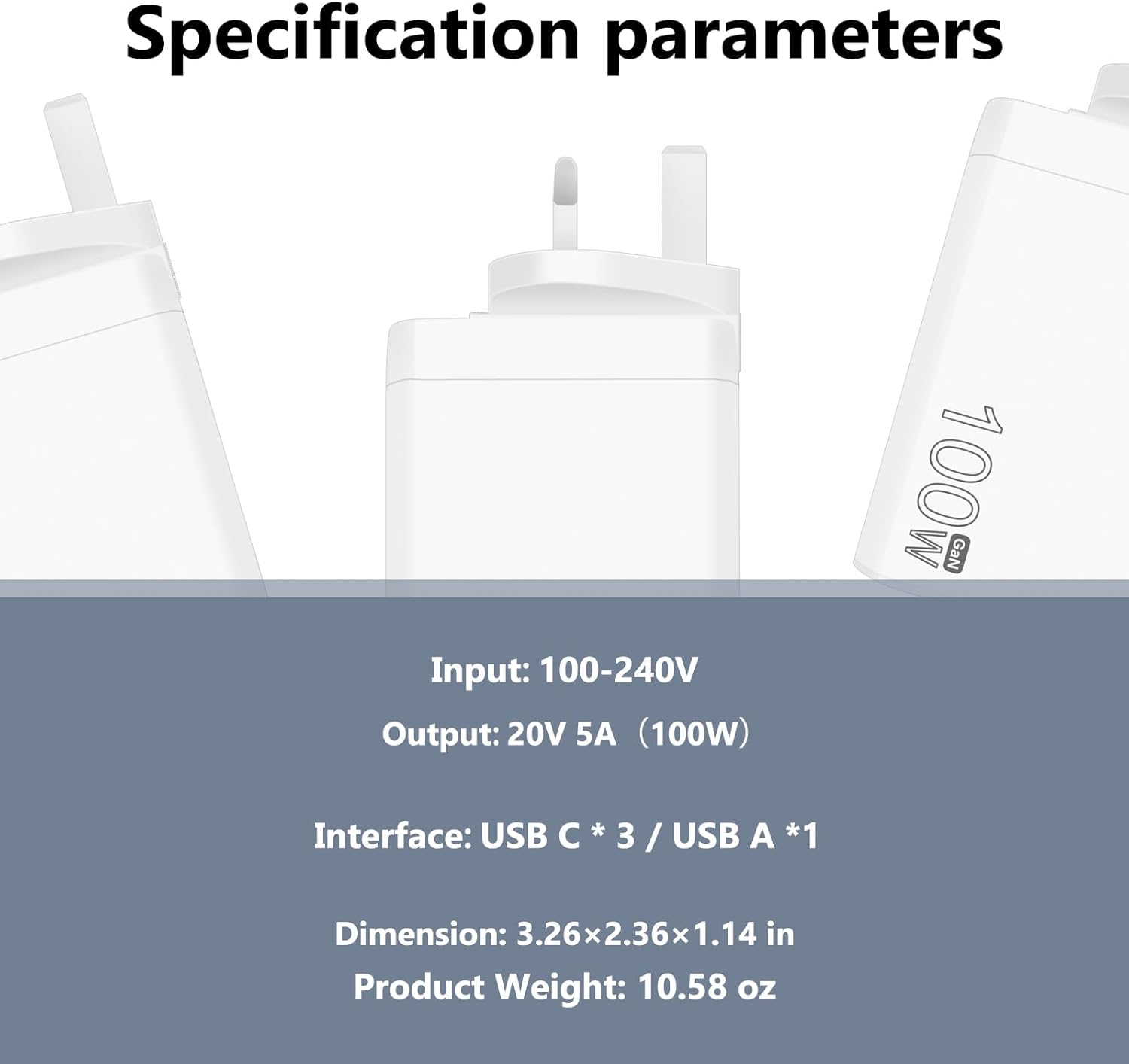 FJEZCHNâs 100w USB wall wart power adaptor is a reasonably small 3 x 6 x 8cm device. The pack also a 2m long usb-c charging cable. Itâs a cool running GaN chipped charger with 4 sockets. 3 USB-C and one USB-A. The power is divided up by the sockets; with the top usb-c being able to deliver 100w; which keeps my power-hungry laptop charged during all but the most intensive applications I run. After that the other 2 usb-câs are 23w which is great for general usb-c devices like phones and cameras. The USB-A can deliver 18watts. The charger will work with lower power devices; I can charge my watch at 10w in the usb c and a socket for example.That said itâs important to note the maximum power is 100w; so, as you add devices the laptops 100w slowly drops down to allow it to send power to other devices. On the road itâs a good solution for keeping things going â when Iâm in the office in meetings I donât need 100w on my laptop charger so my phone can draw 20w charging without compromising anything.Itâs very good value for a charger and charging cable.