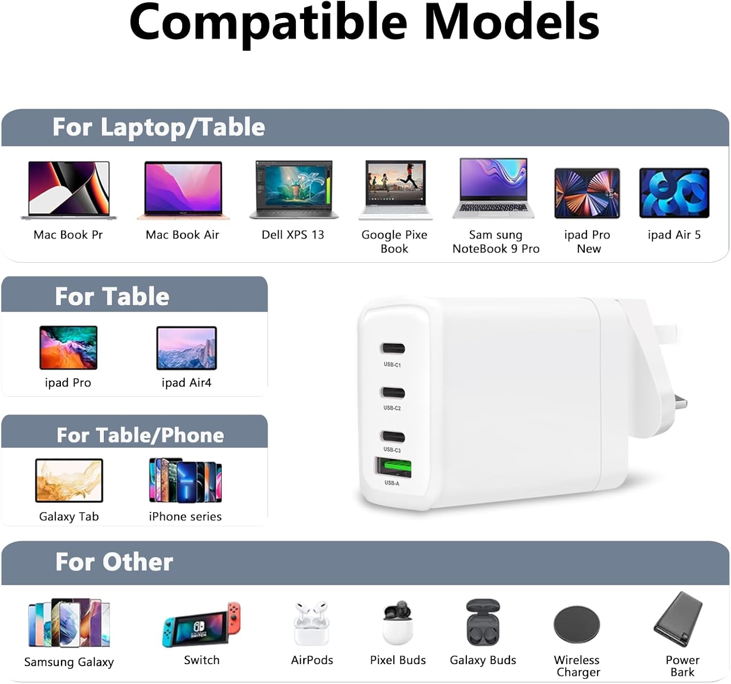 Our 100W GaN Laptop Charger Is Specially Designed for Mac book Laptops, Compatible with Various Models for Mac book Mac book Pro Mac book Air and More. It Also Supports Other Devices Such as Power Banks, Tablets, and Laptops. Equipped with an Intelligent Chip, It Provides Multiple Protections Against Over-Voltage, Over-Current, Over-Temperature, and Short-Circuit, Ensuring Safe Charging. Its Lightweight and Portable Design Makes It Ideal for Home, Office, Travel, and Other Scenarios