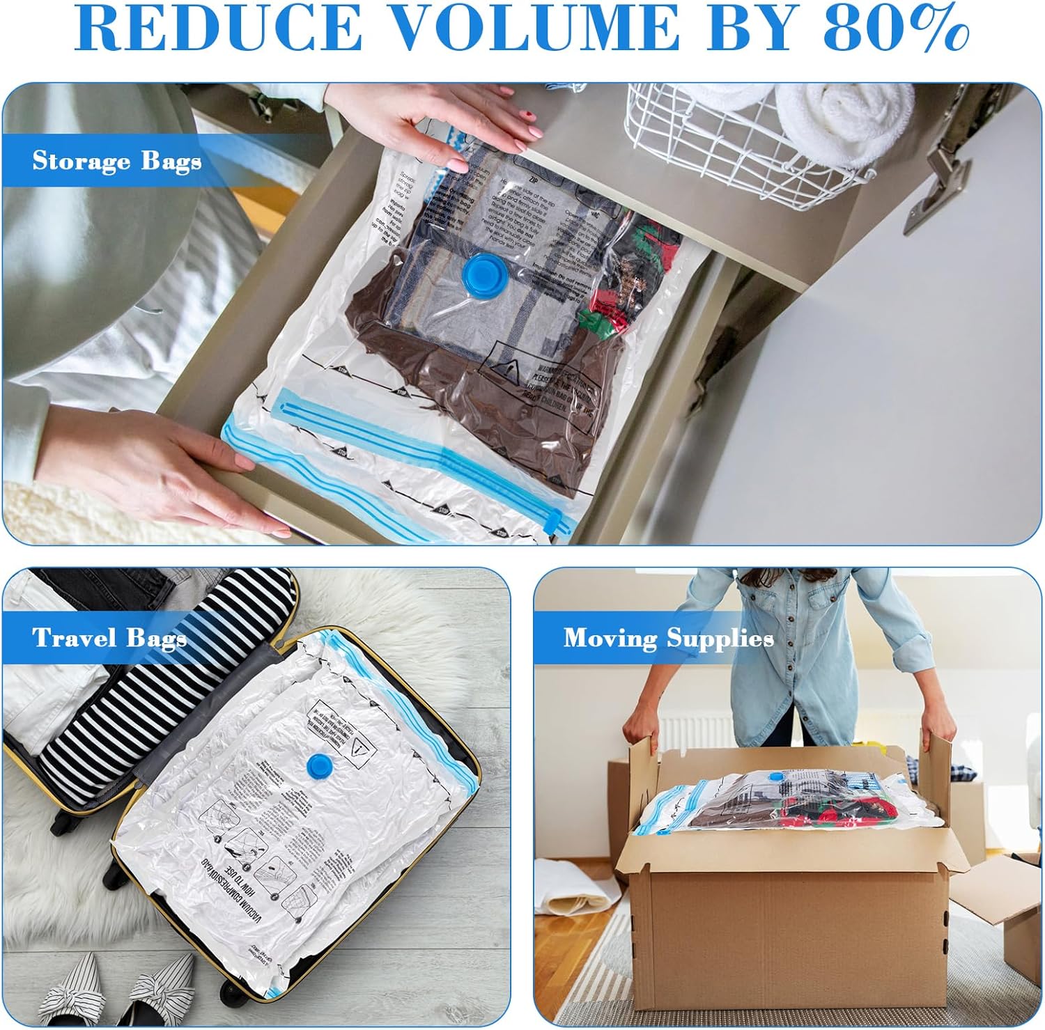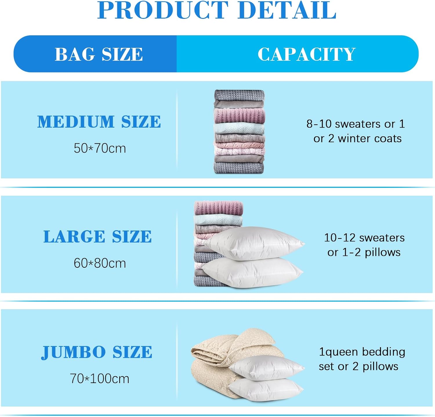 6 Large Bags(80x60cm) : Vacuum storage bags offer a perfect solution for storage, which you can store your seasonal clothes, sweaters, pillows and more. Easily create 80% more space!