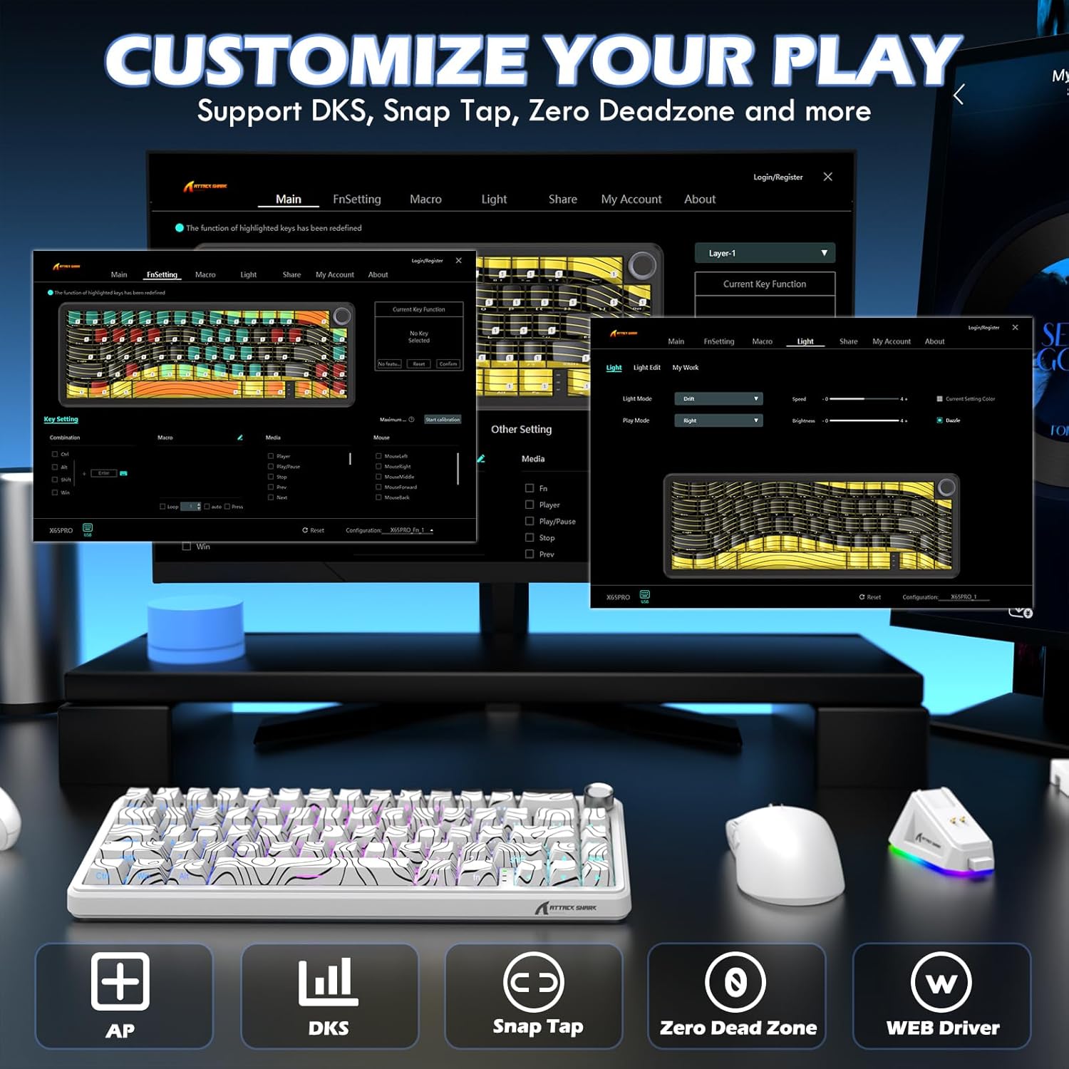 ATTACK SHARK X65PRO HE keyboard features Hall effect magnetic switches with 0.01mm precision actuation adjustment (0.1-3.4mm global range), 8000Hz polling rate (0.125ms latency), adjustable actuation points, advanced snap tap technology with last keystroke prioritization, one-key multiple actions, and a self-developed web driver for customizable macros, RGB lighting, and performance settings, delivering a safer and more personalized gaming experience.