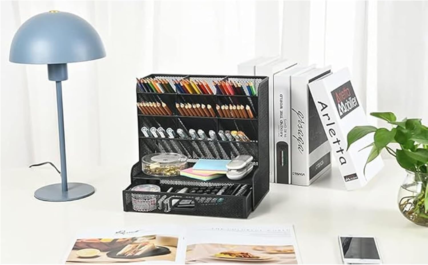13 reviews for Marbrasse Mesh Desk Organiser, Multi-Functional Pen Holder, Pen Organiser for Desk, Desktop Stationary Storage Rack for School Home Office Art Supplies (Balck Pen Holder with Drawer)